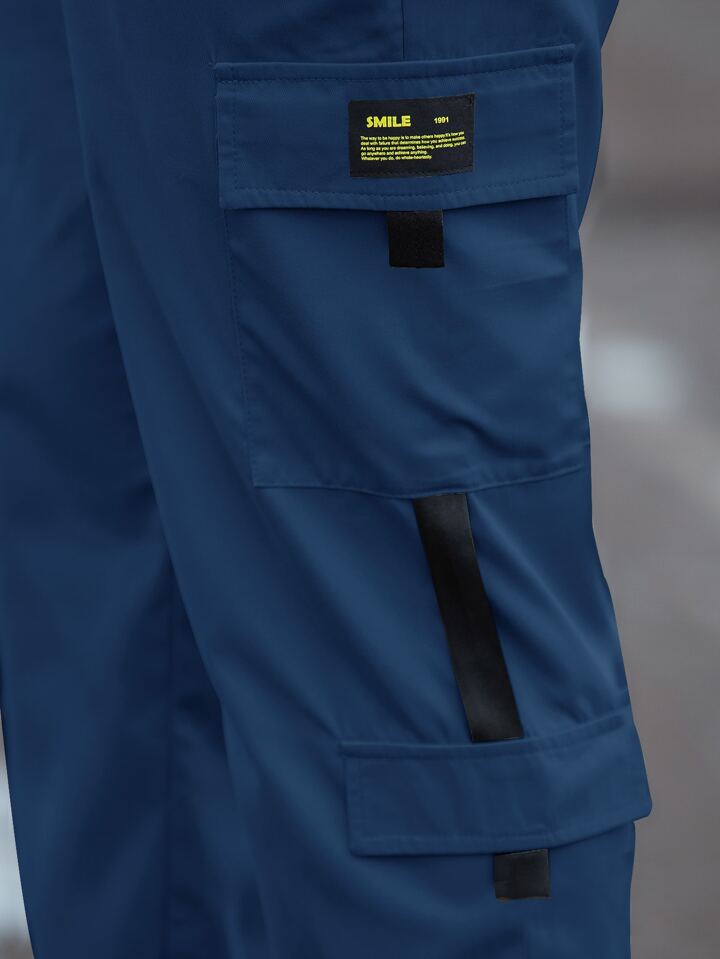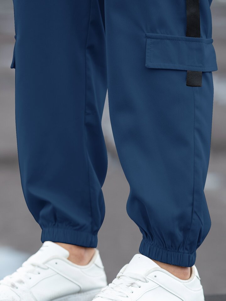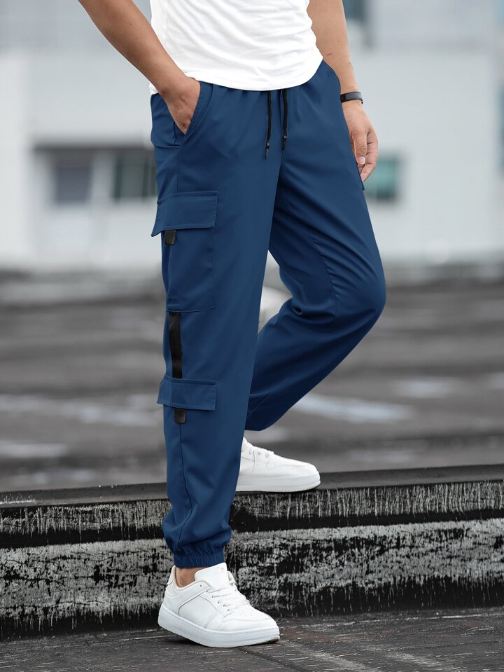 Pantalones Cargo Holgados Con Diseño De Parches Y Múltiples Bolsillos Con Cordón En La Cintura Para Hombres