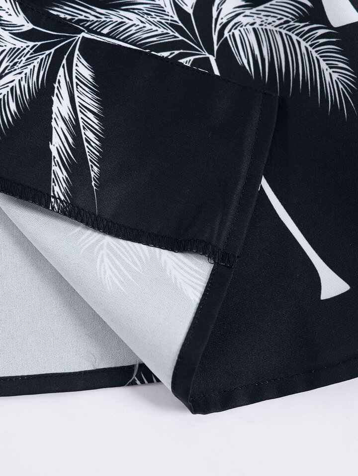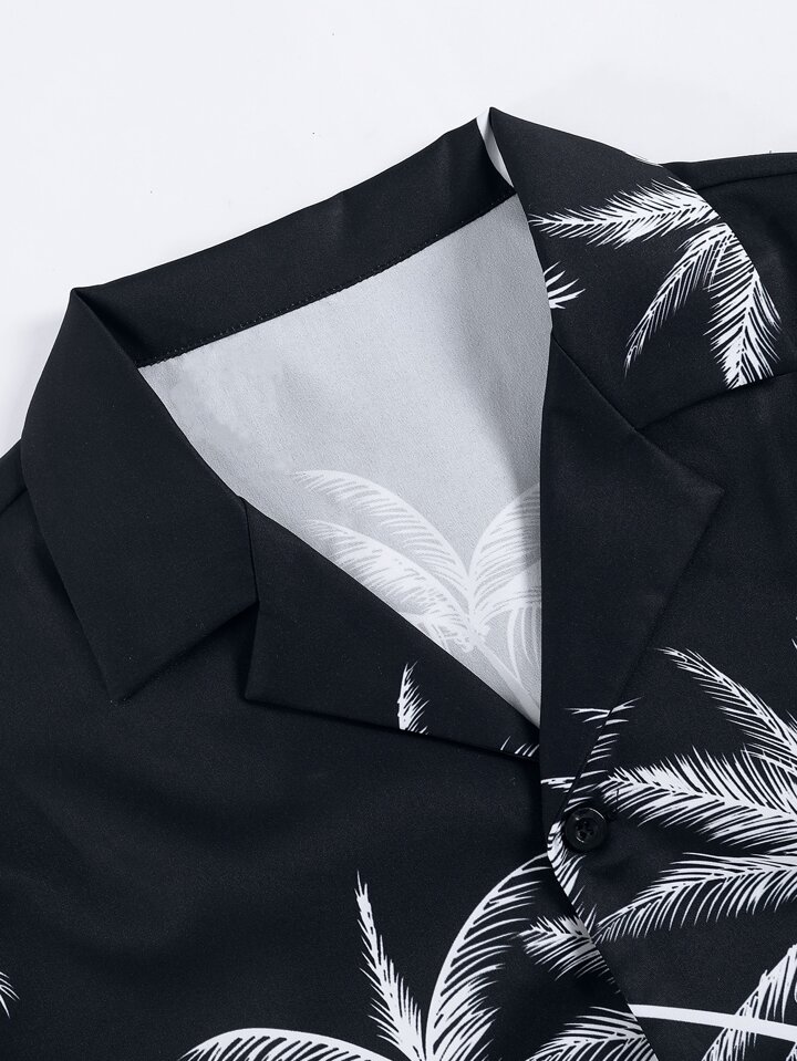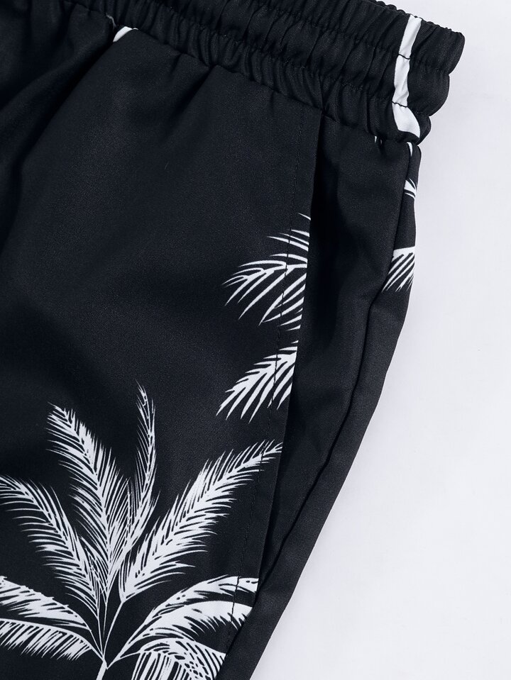 Camisa con estampado de palmeras y pantalones cortos con cordón en la cintura sin camiseta para hombre, conjunto cómodo para vacaciones
