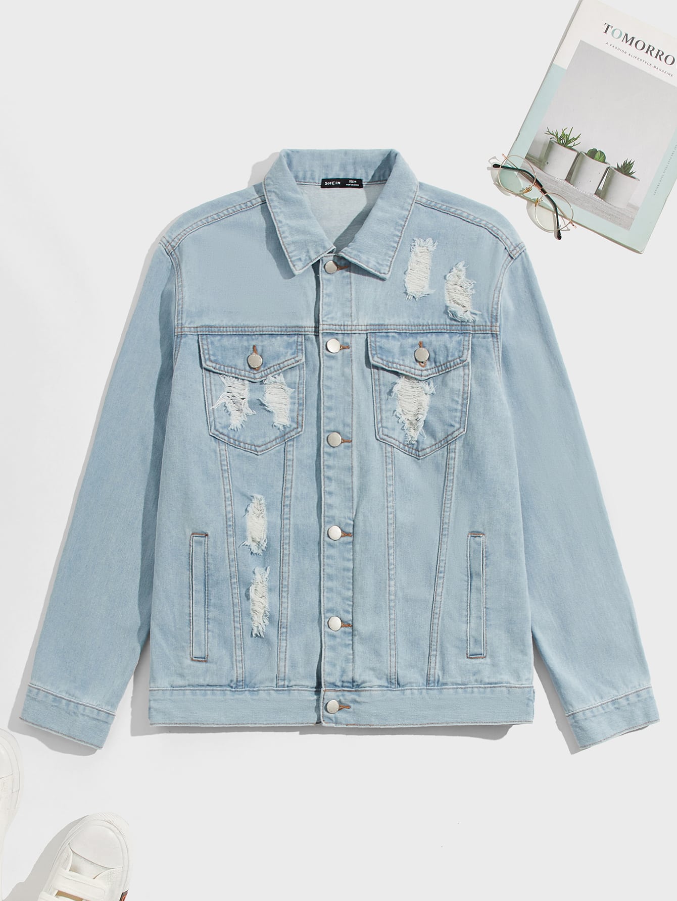 Hombres Cazadora mezclilla desgarro con bolsillo con solapa