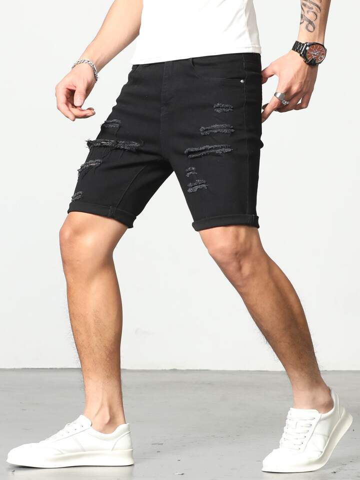 Hombres Shorts mezclilla bermuda algodón desgarro crudo bajo de doblez