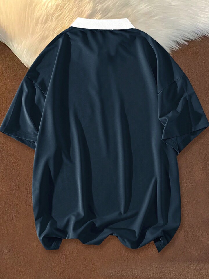 Camiseta Polo Holgada Para Hombre Con Eslogan Gráfico, Cuello De Contraste Y Hombros Caídos
