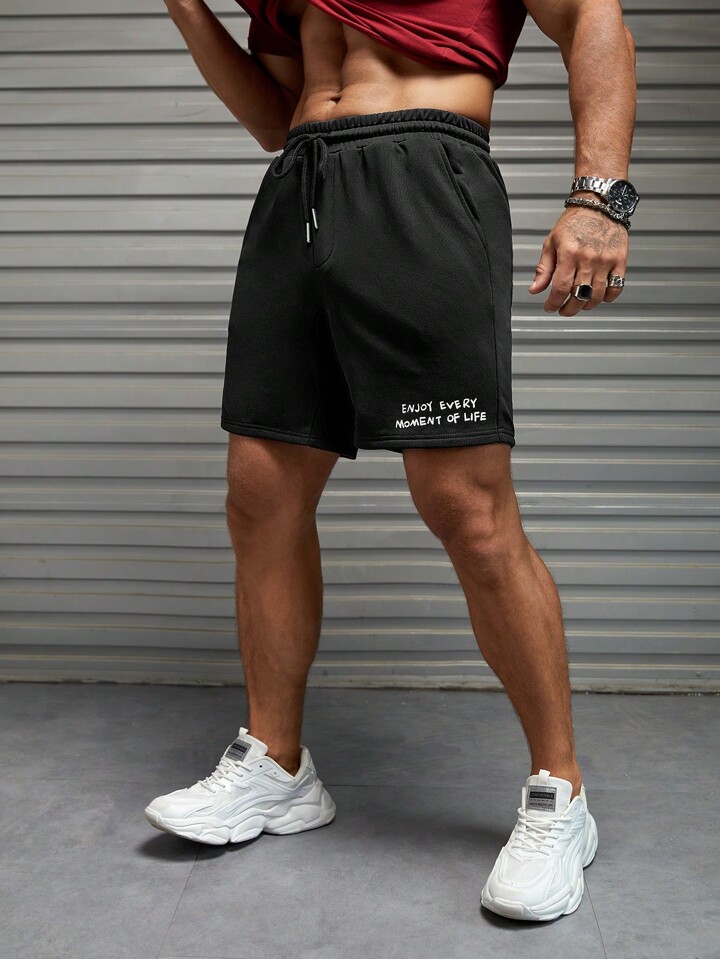 Hombres Shorts con estampado de slogan de cintura con cordón
