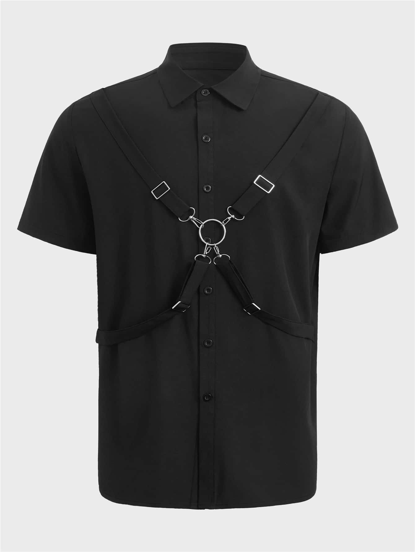 Hombres unicolor con botón delantero Cinturón arnés adorno Camisa