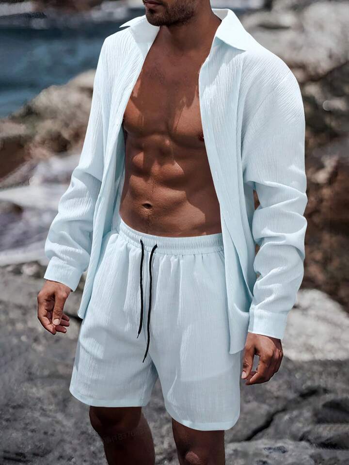 Camisa De Hombre Sólida Con Botones Y Pantalones Cortos De Cintura Con Cordón