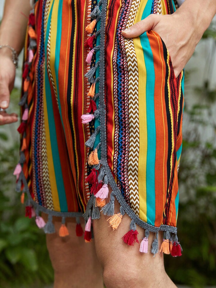 Pantalones Cortos Holgados Para Hombre Con Estampado De Rayas Y Detalle De Borlas