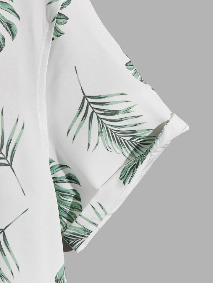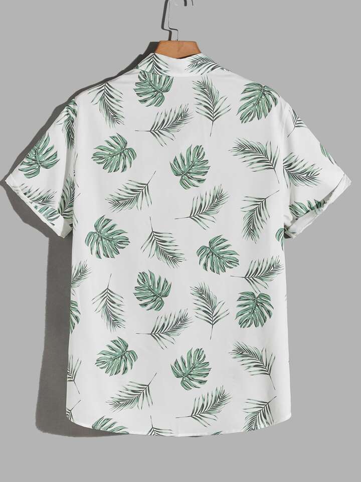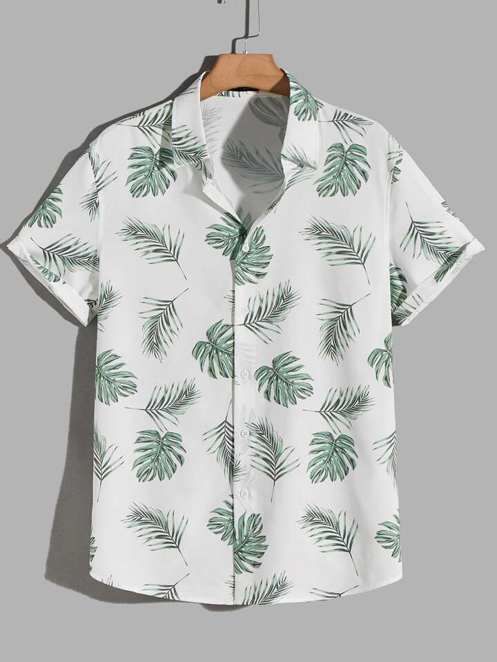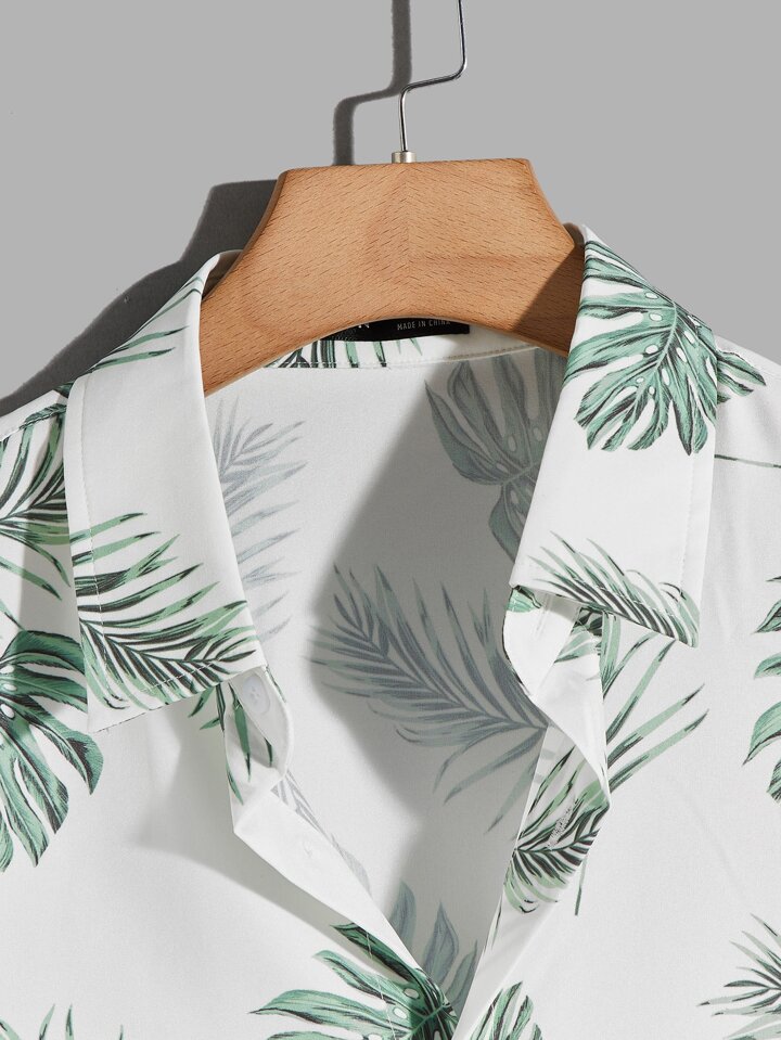 Camisa tejida de manga corta con estampado de hojas para uso casual, diario, playa y vacaciones, corte slim fit para hombre