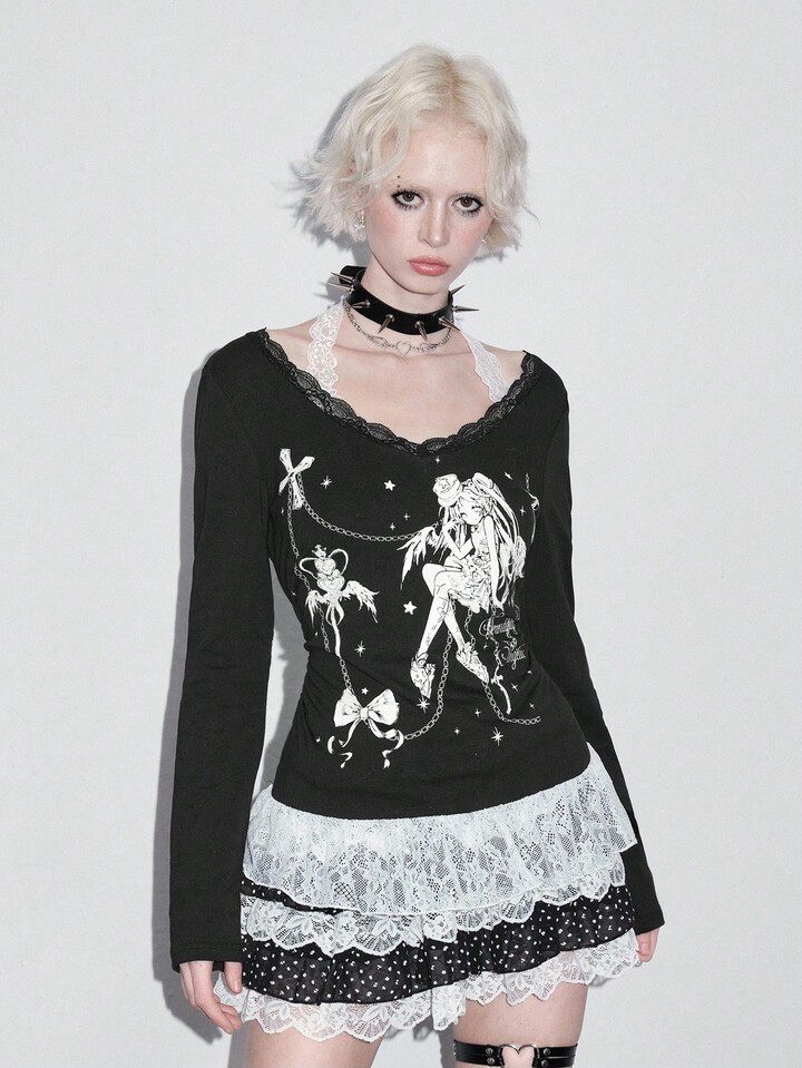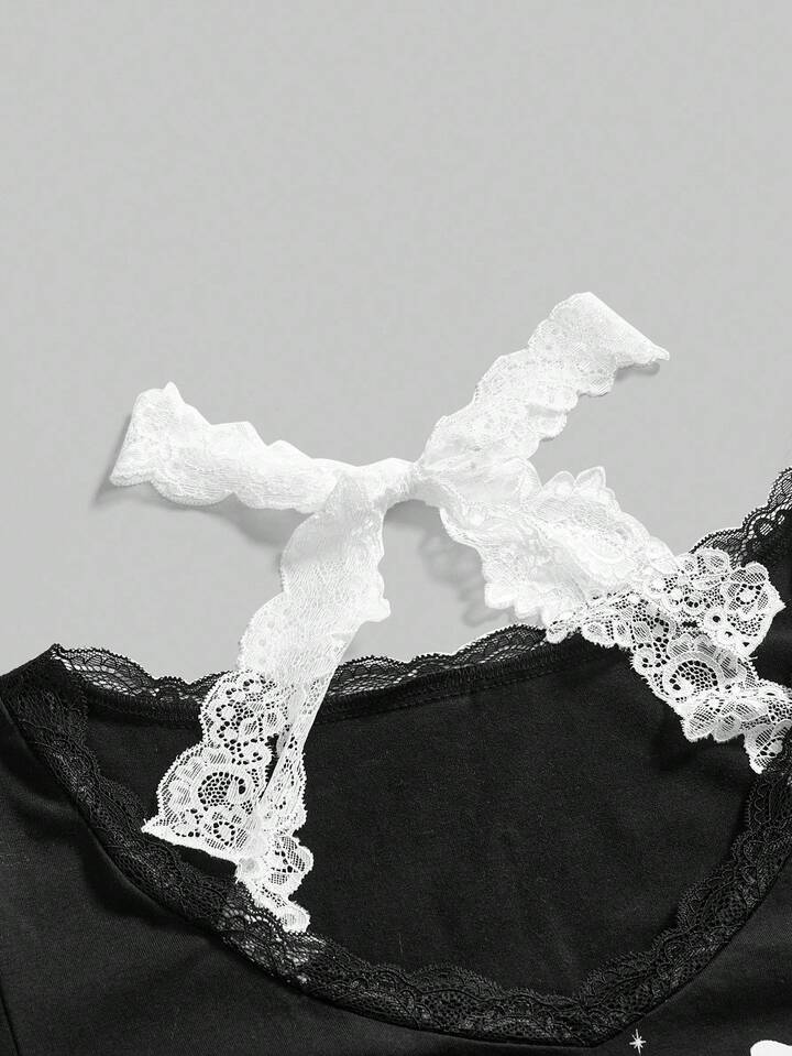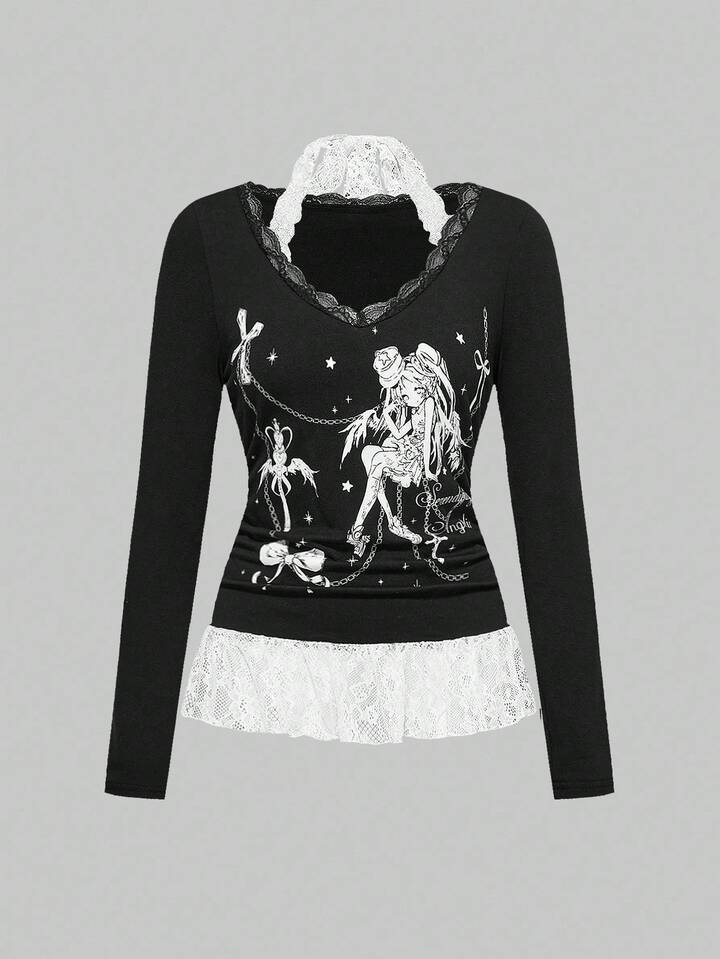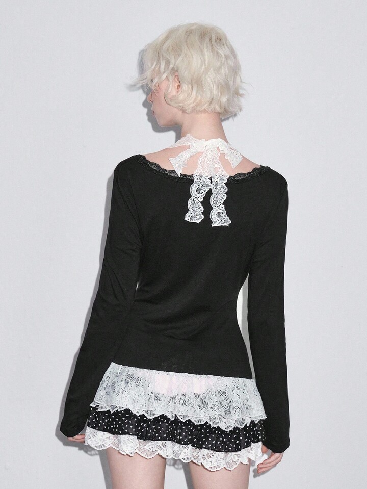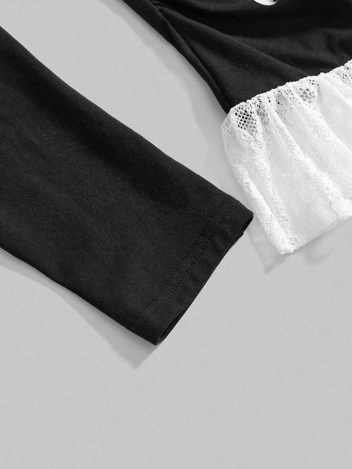Camiseta de manga larga con contraste de encaje oscuro y lazo de estilo anime de Halloween (incluye camiseta interior de encaje y bajo de encaje retazado)