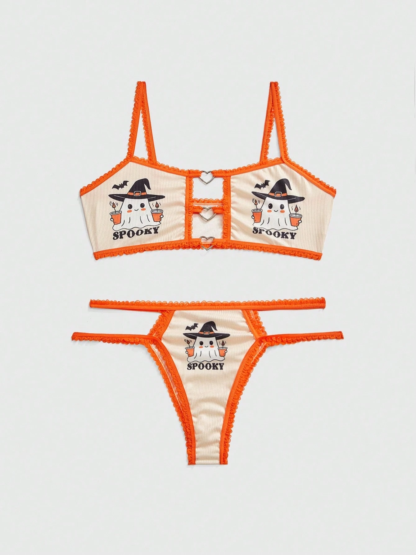 Conjunto de lencería de sujetador y tanga con hebillas metálicas de fantasma, murciélago, vela y corazón de dibujos animados de Halloween