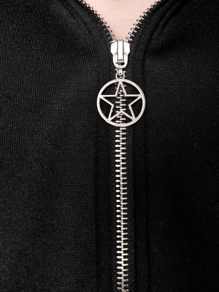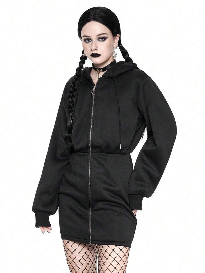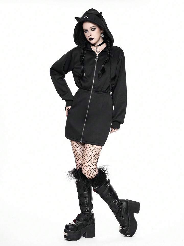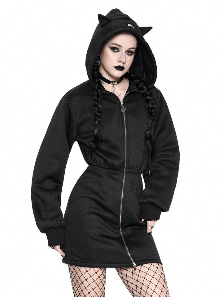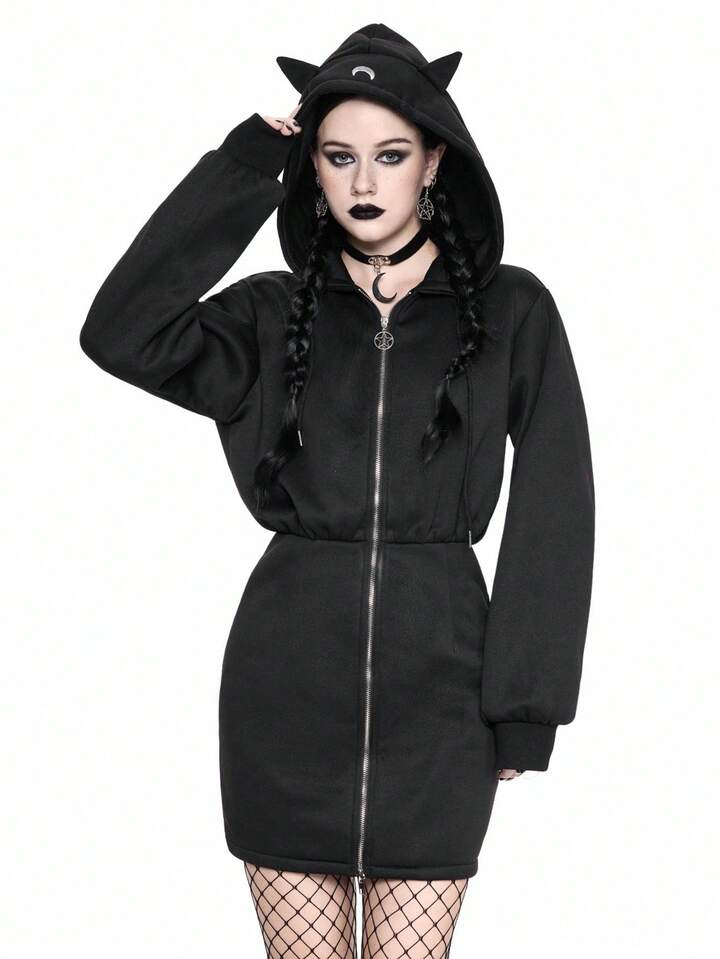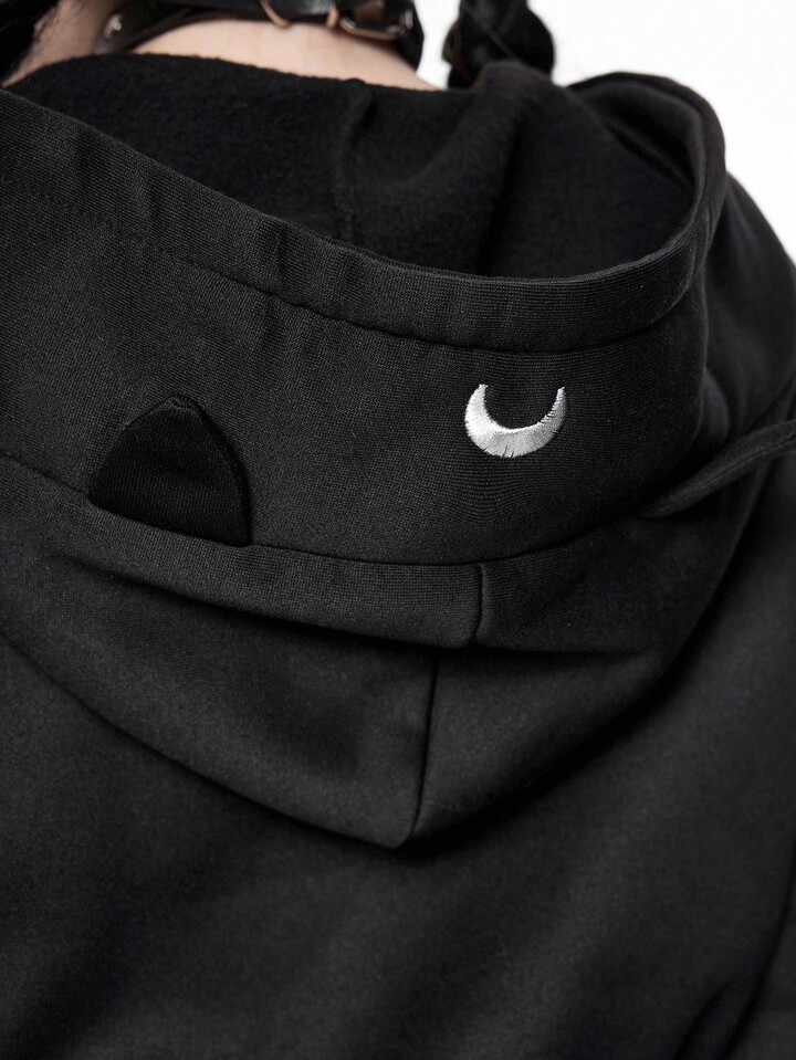 Goth Sudadera con capucha con cremallera y bordado de orejas de gato y luna estilo gótico para mujer