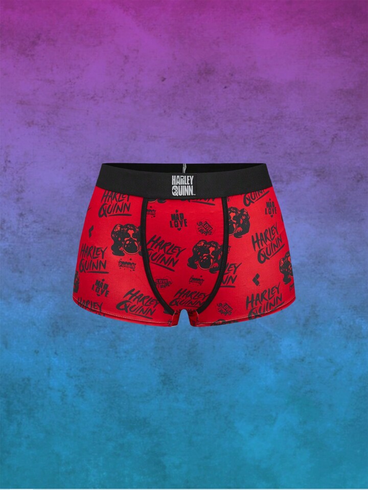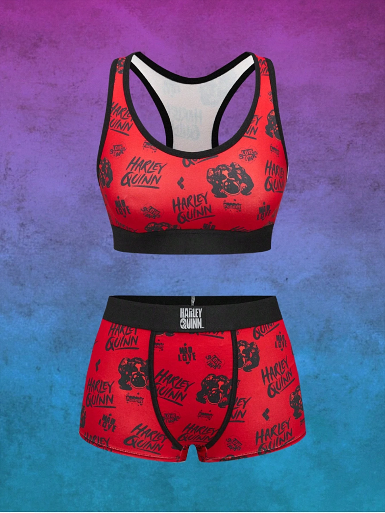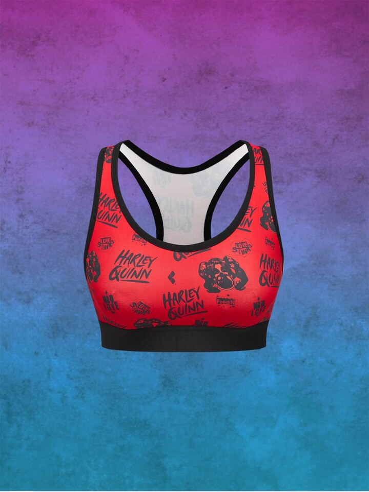 Harley Quinn | ROMWE Conjunto de sujetador deportivo y pantalones cortos estilo boyshort con diseño de personaje de dibujos animados e impresión de letras, diseño de espalda de nadador sin aros de acero