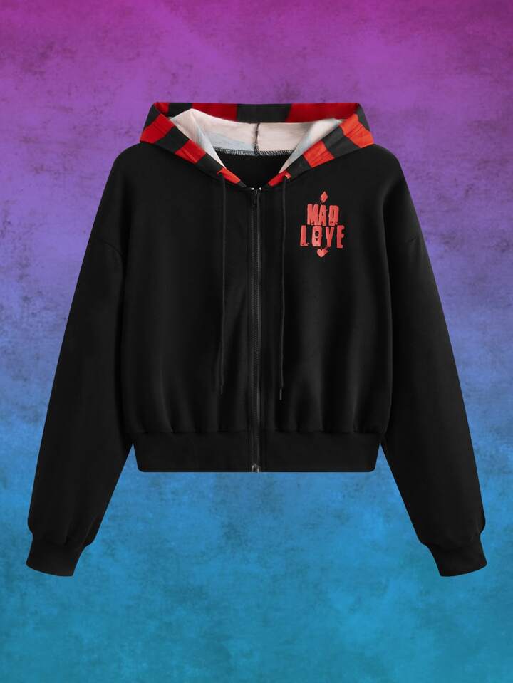 Harley Quinn | ROMWE Capucha con letra con estampado de figura de dibujos animados con cremallera con cordón