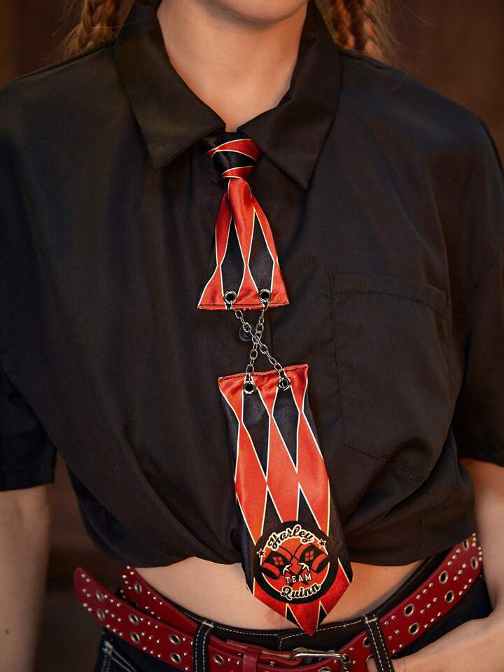 Harley Quinn | ROMWE Corbata con detalle de cadena cruzada, patrón de argyle y letra para mujeres