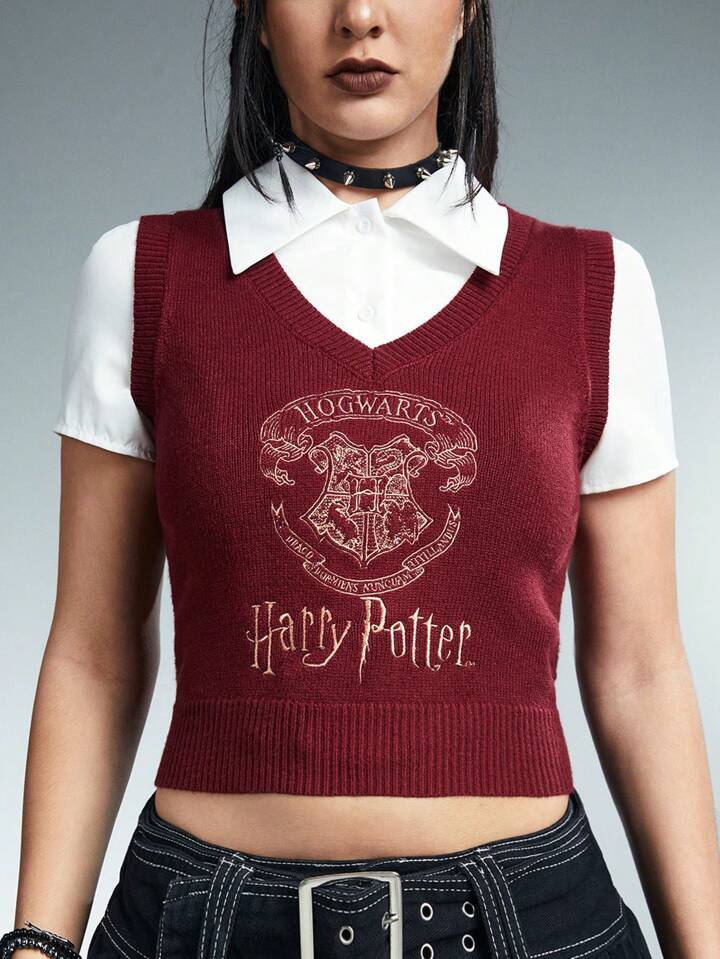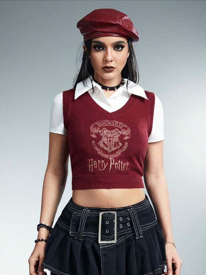 Harry Potter | ROMWE Chaleco de escuela con estilo universitario, diseño de logo animal y patrón de letras, suéter corto