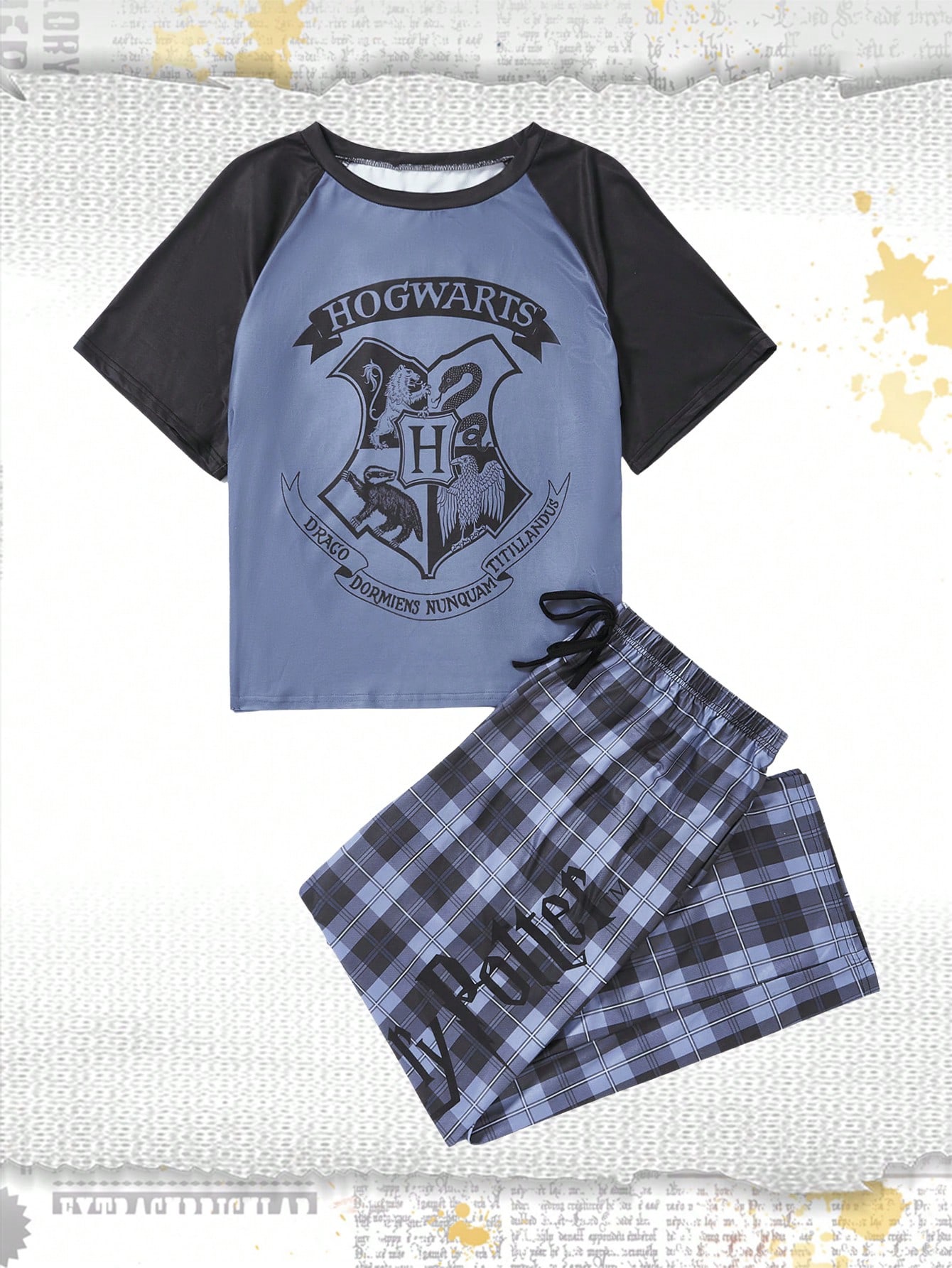 Harry Potter | ROMWE Talla grande Conjunto de pijama con estampado de cuadros y slogan de manga raglán