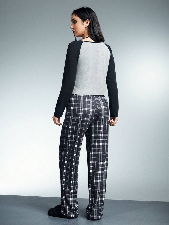 Harry Potter | ROMWE Conjunto de pijama con parte superior con escote de muesca, mangas raglán y estampado de letras y emblemas animales, y pantalón a cuadros para mujer