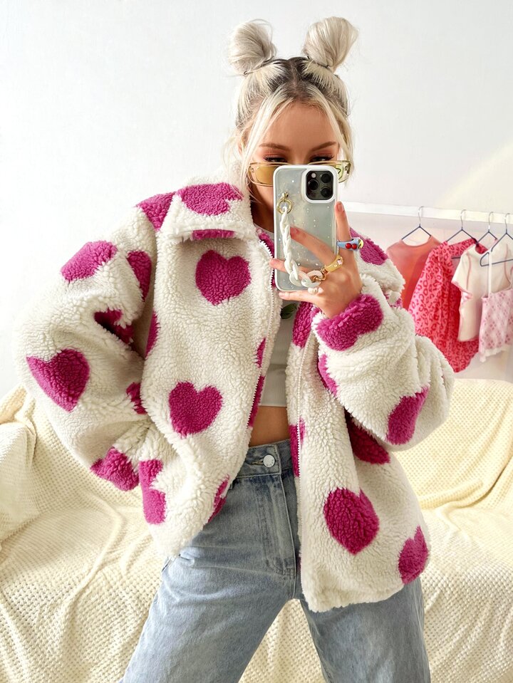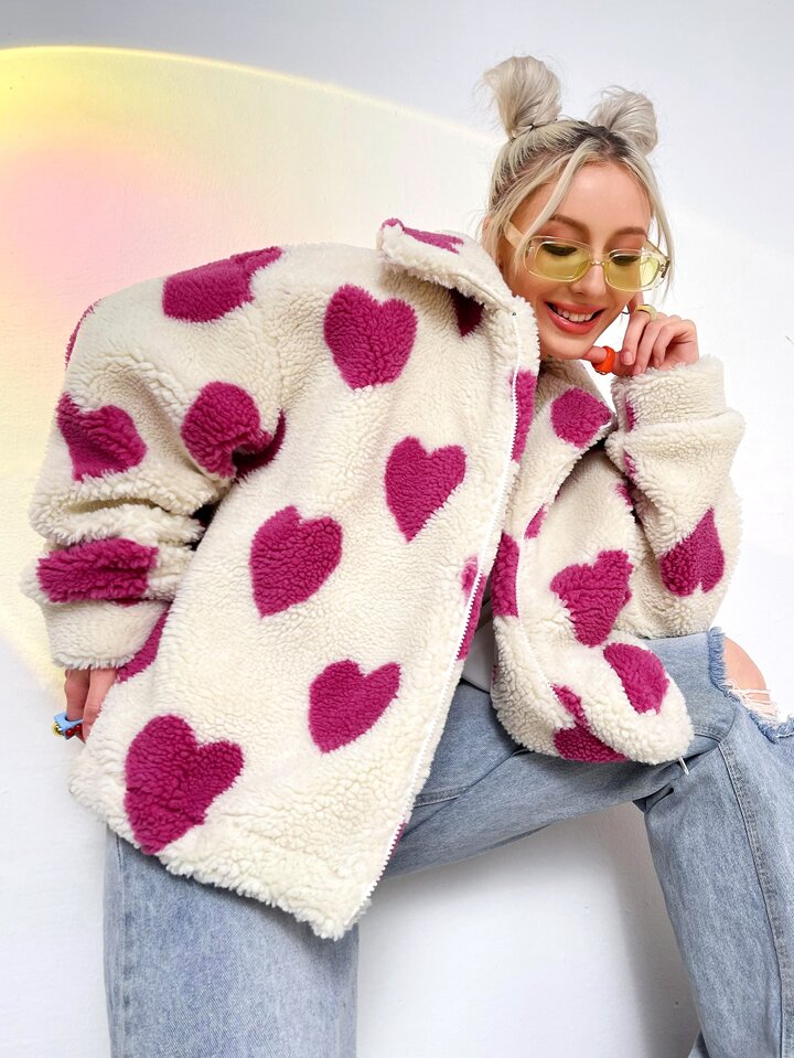 Cazadora con patrón de corazón de hombros caídos forro polar