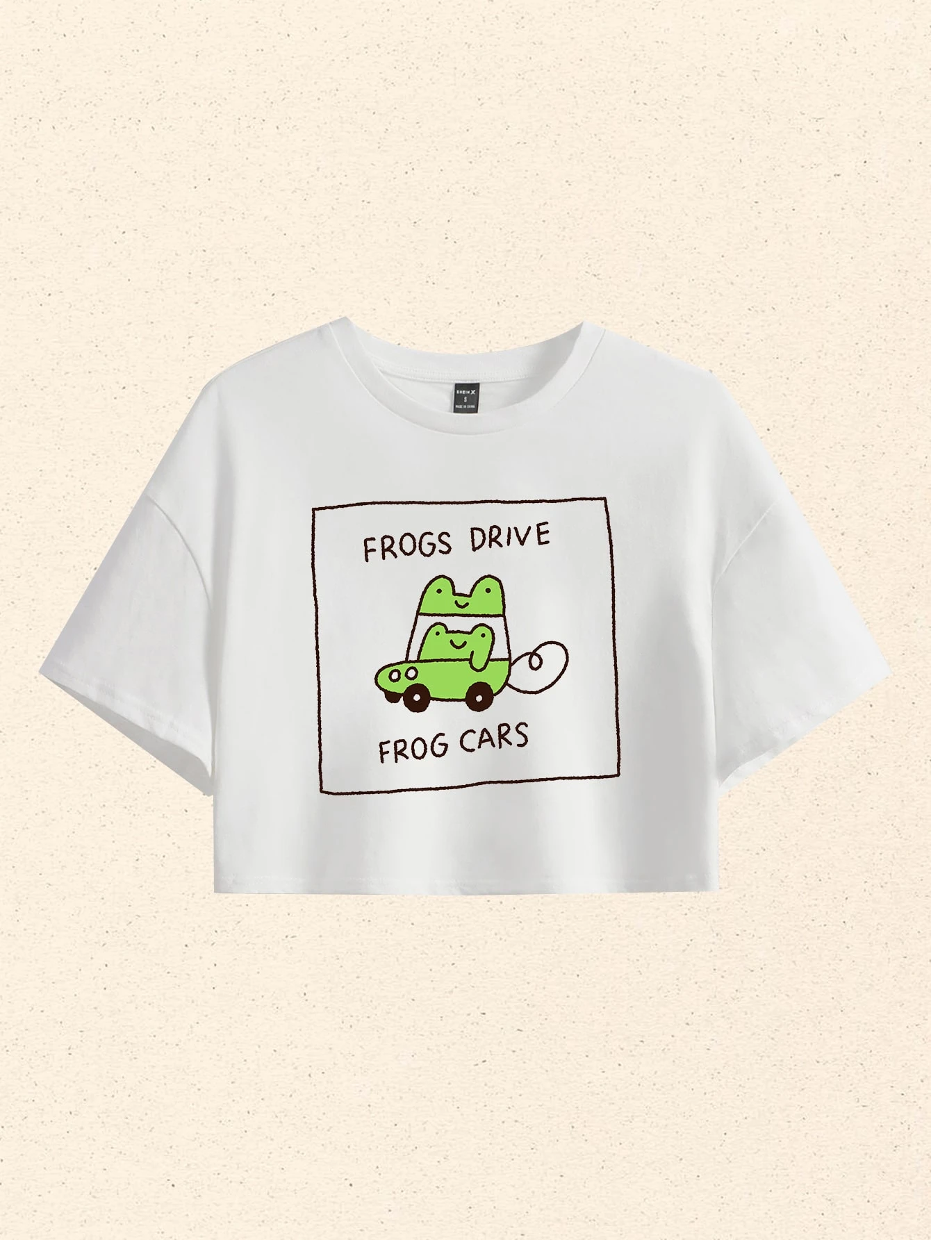Heyheymomo Camiseta crop con estampado de slogan y dibujos animados de hombros caídos