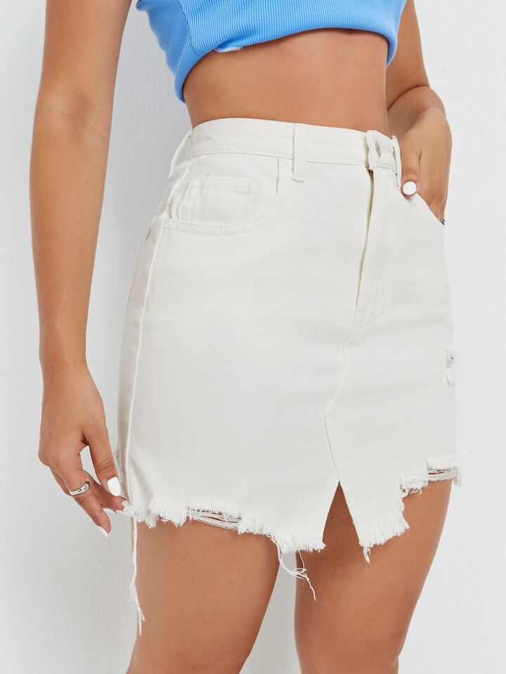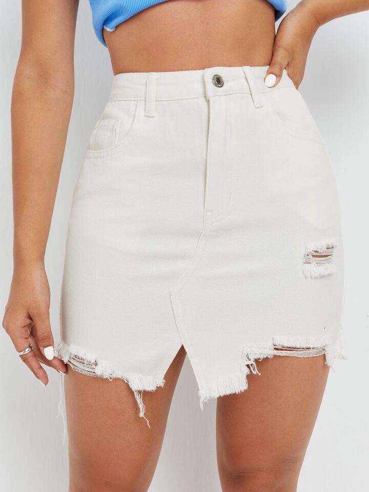 Falda mezclilla bajo asimétrico rota bajo crudo de cintura alta