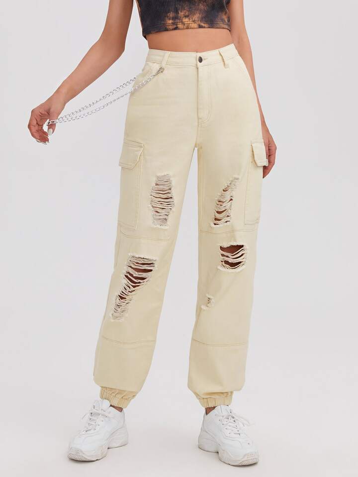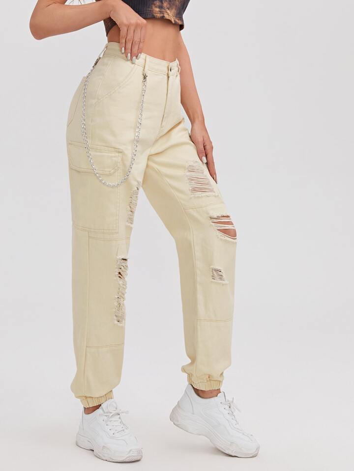 Jeans cargos rotos de lado con bolsillo con solapa con caden a