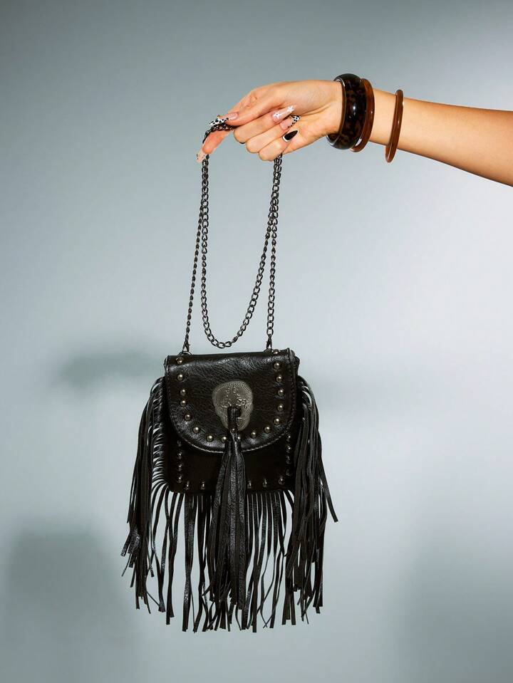Hippie 1 pieza Bolso de hombro de mujer con sobre, calavera, borlas y remaches, estilo europeo y americano, bolso de cruz para dama