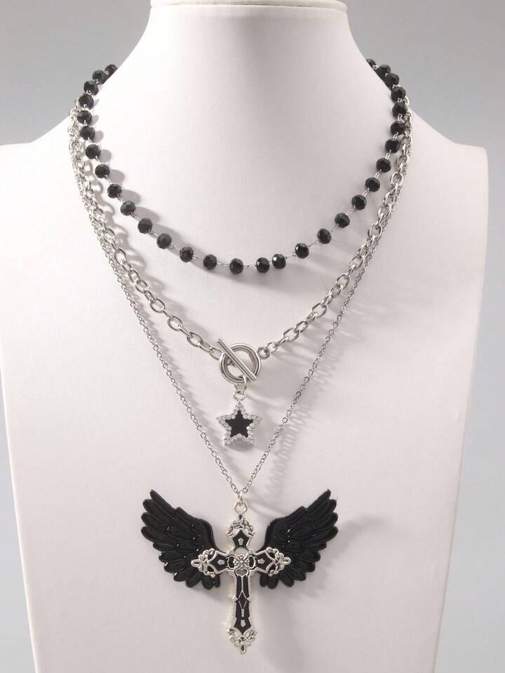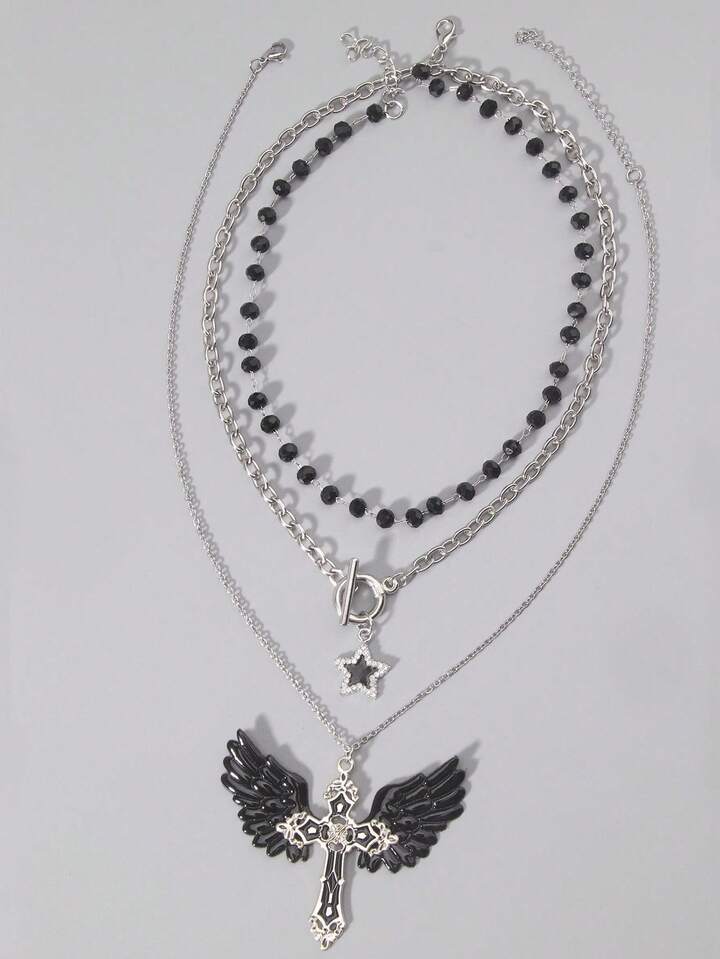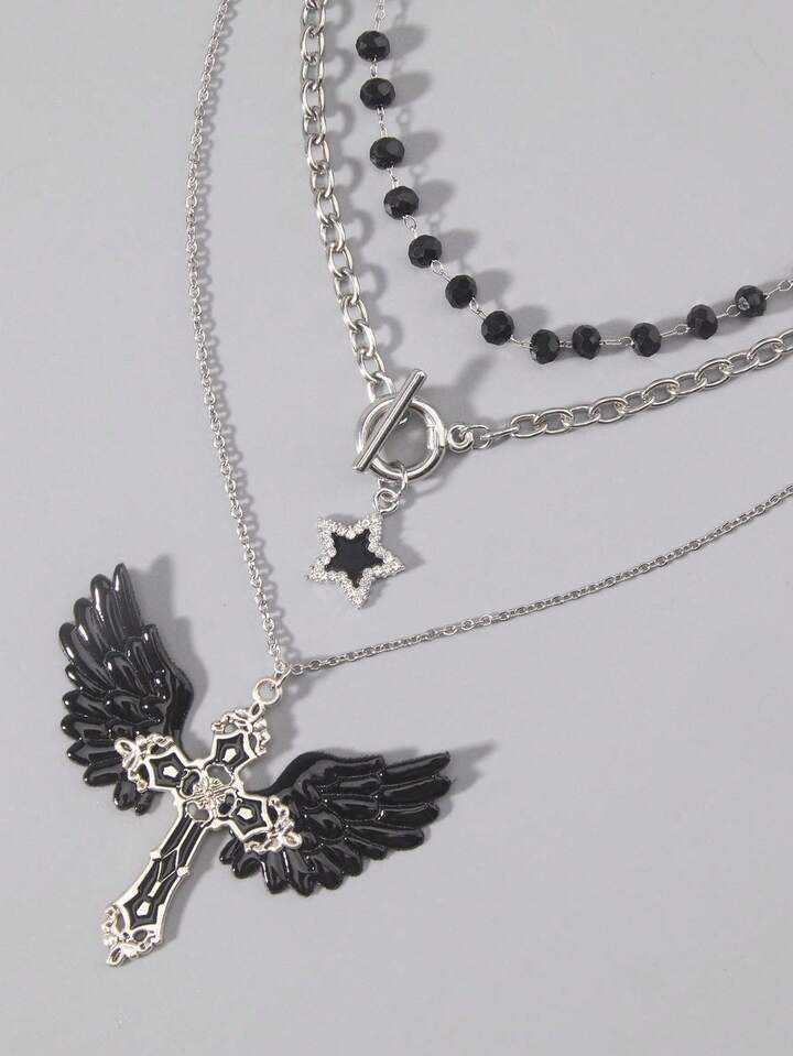 Hippie 2 piezas Gargantilla con colgante de alas de ángel oscuro y cruz con perla falsa gótica y oscura para mujer, regalo para ocasiones especiales