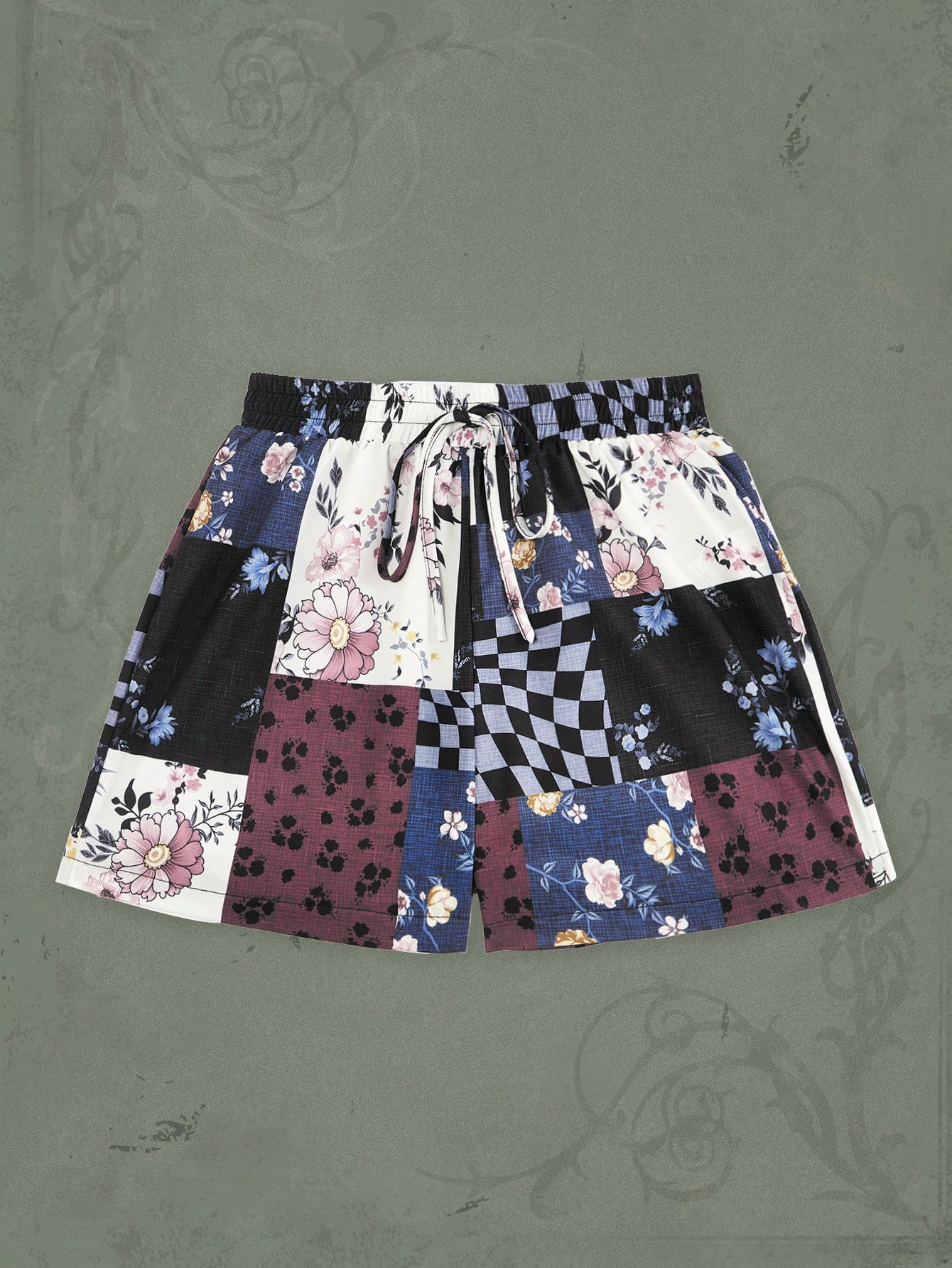 Hippie Shorts floral & de cuadros con estampado de retazo de cintura con nudo