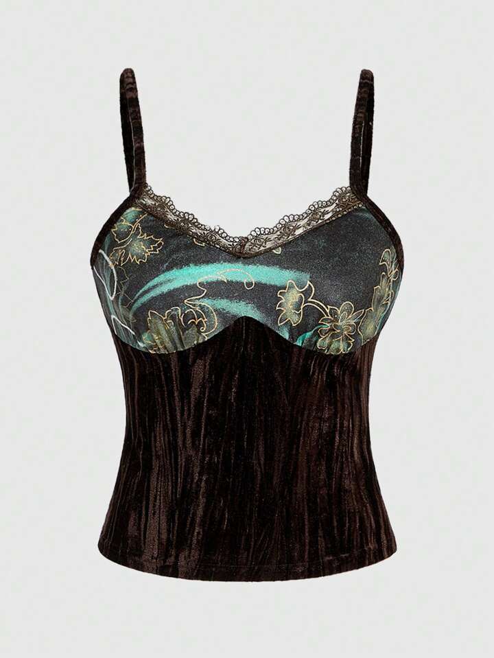 Hippie Top De Camisola Entallada Floral Impreso Y Encaje Empalmado