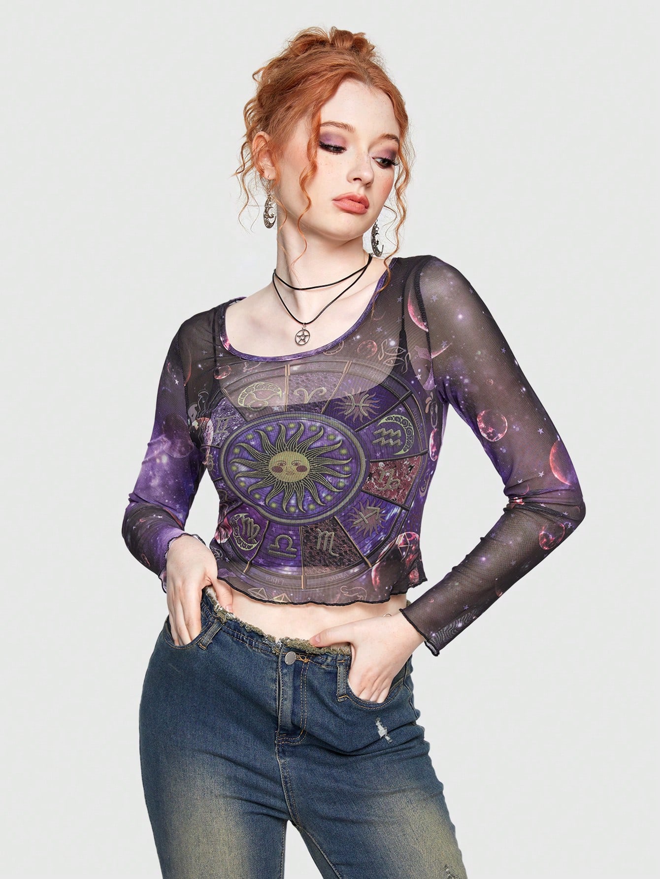 Hippie Top con estampado de galaxia ribete en forma de lechuga de malla transparente sin sujetador