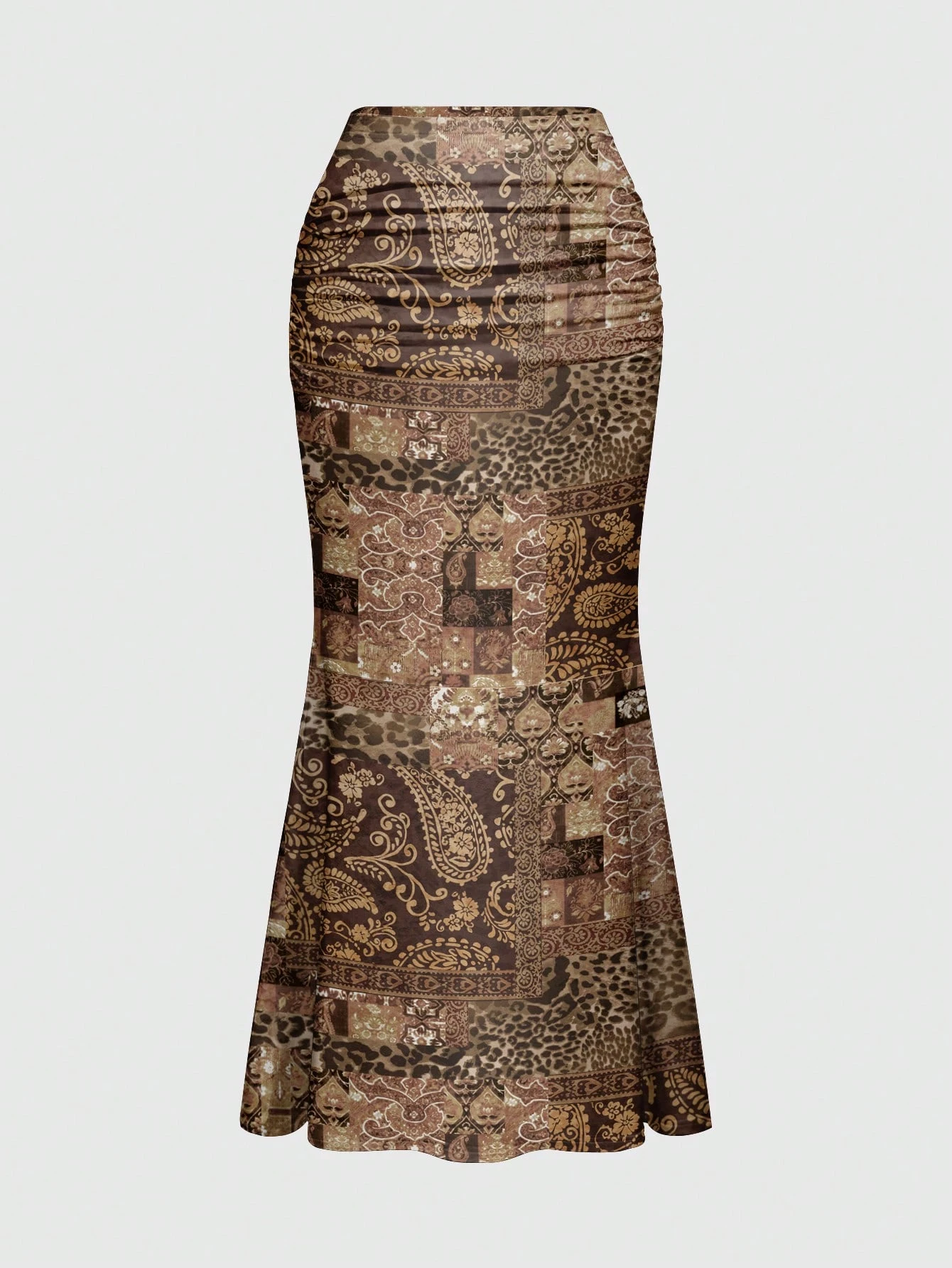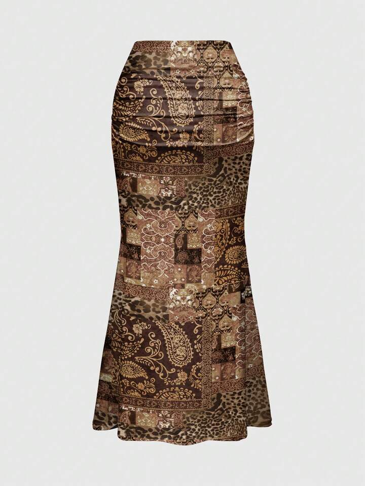 Hippie Falda ajustada de sirena con estampado de leopardo, patchwork y paisley, con pliegues fruncidos