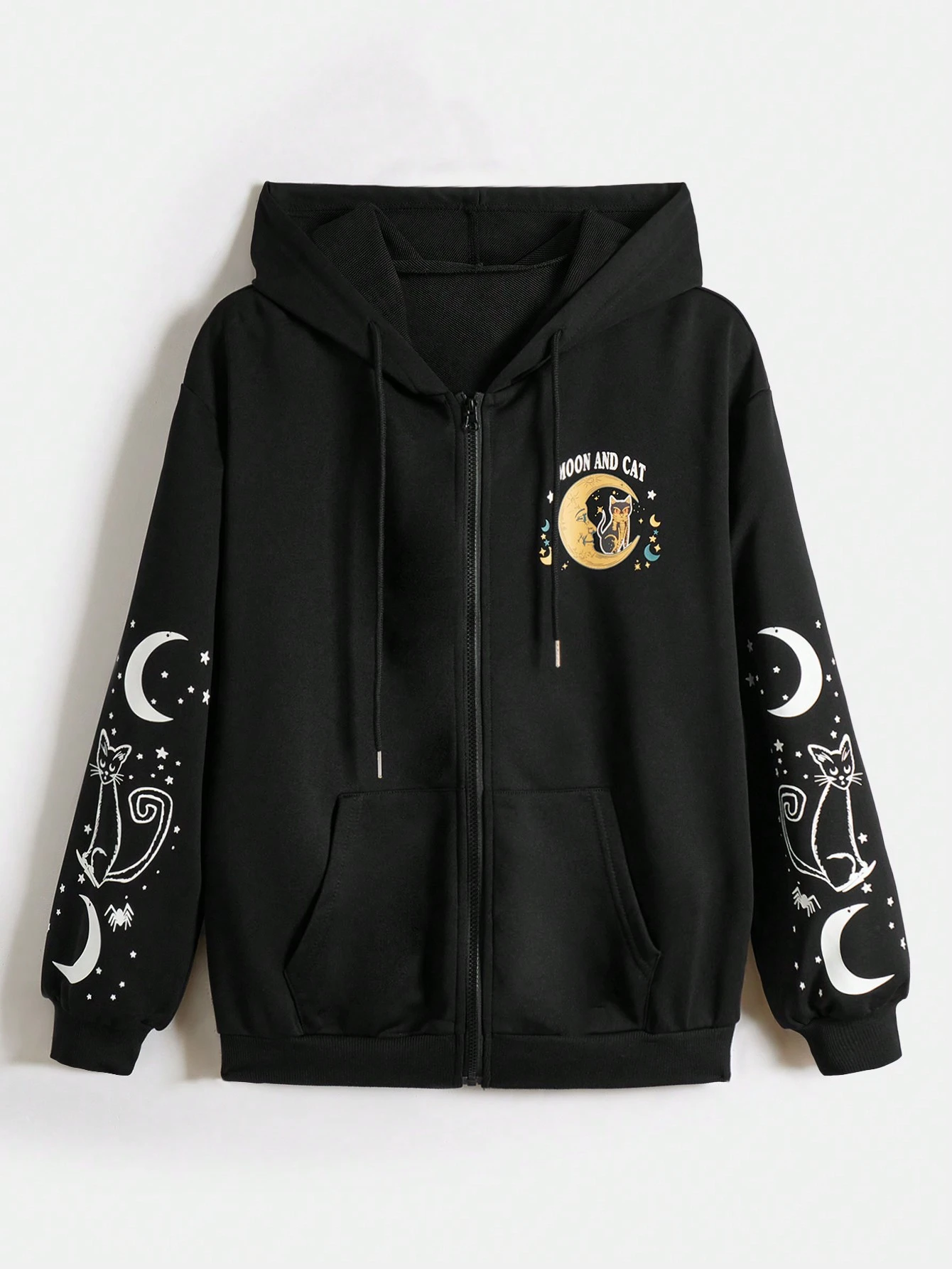 Hippie Capucha luna & con estampado de gato con cremallera con cordón de hombros caídos