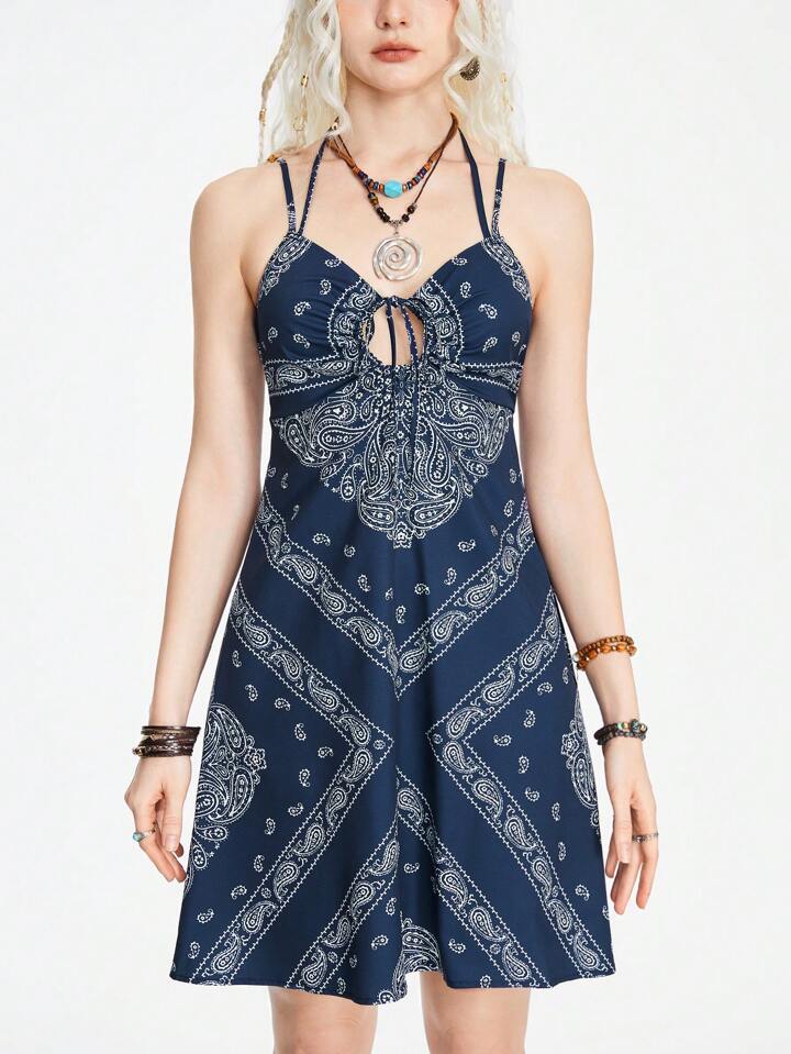 Hippie Vestido de tirantes con estampado paisley y lazo frontal para las vacaciones de verano