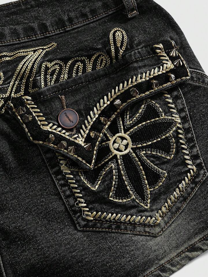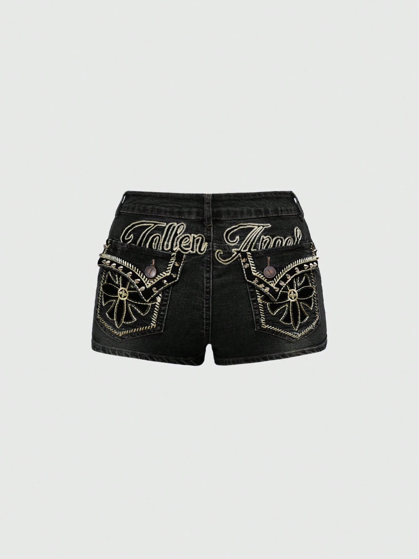 Pantalones cortos vaqueros con parches bordados estilo hippie, bolsillos y estampado de inglés