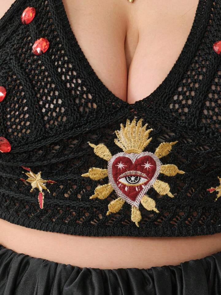 Hippie Top corto con bordado de flores y gemas en estilo gótico barroco para mujer, de verano, talla grande