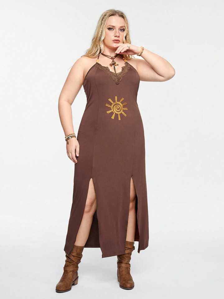 Hippie Vestido largo en tamaño grande para vacaciones de verano, con encaje bordado y ribeteado, con escote en V