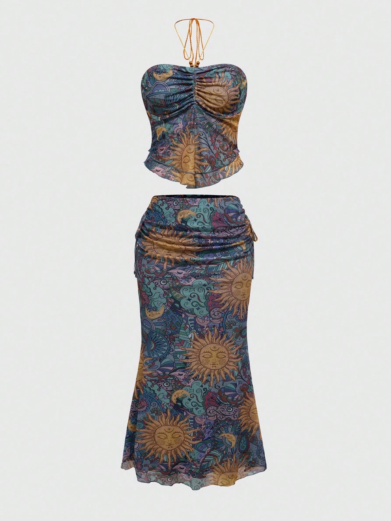 Conjunto de 2 piezas de top halter y minifalda de talla grande con estampado de sol y luna totémico estilo Y2K hippie
