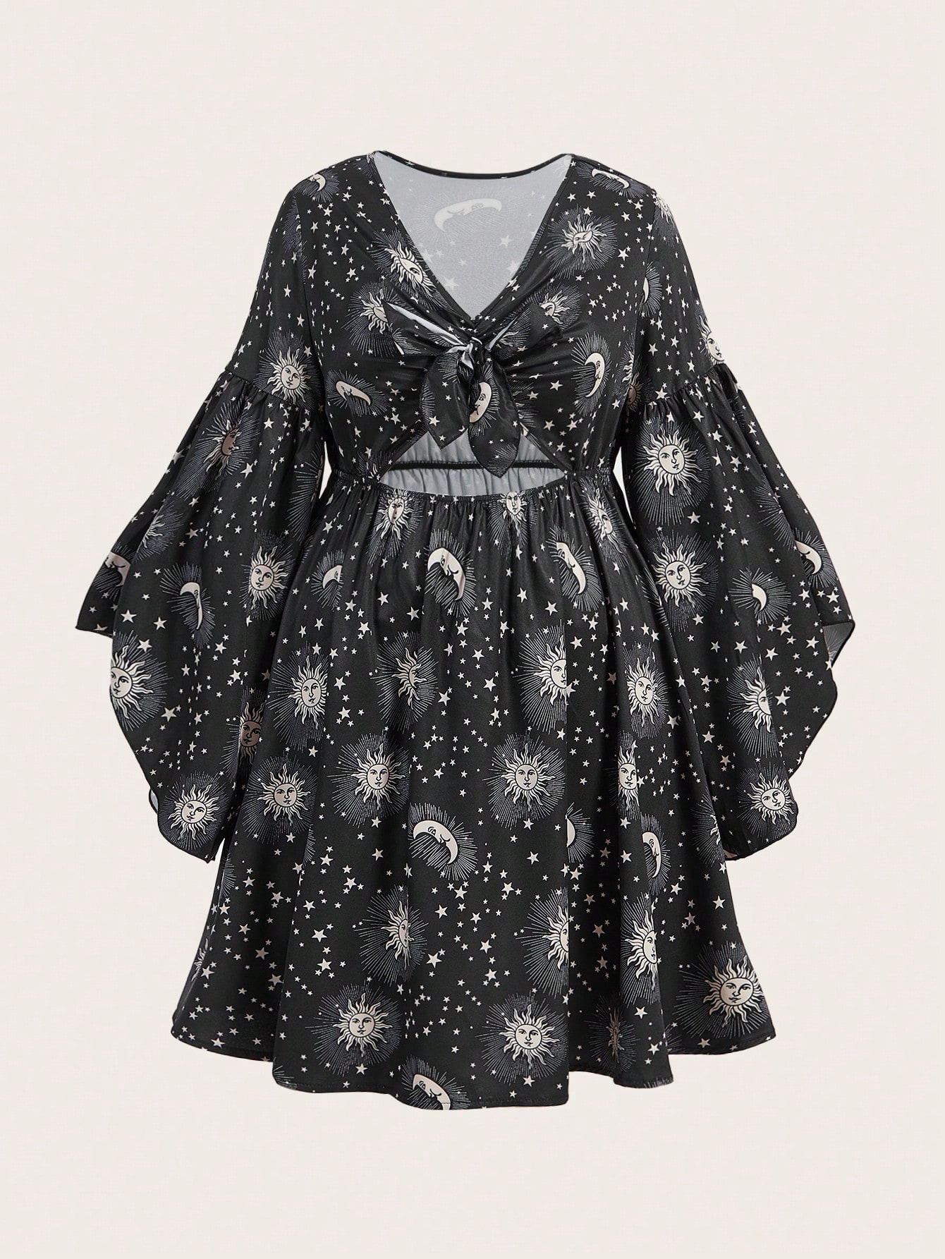 Hippie Talla grande Vestido con estampado de sol y luna con nudo delantero de manga con volante