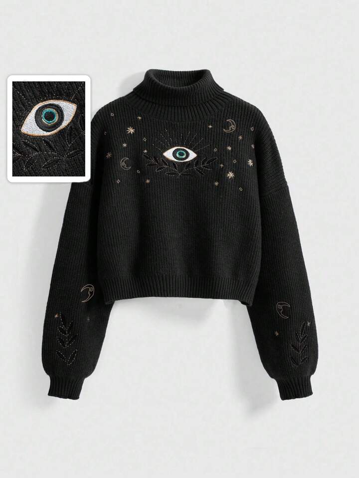 Hippie Suéter de cuello redondo con bordado de luna y estrellas en estilo retro bohemio y de vacaciones, en azul-verde