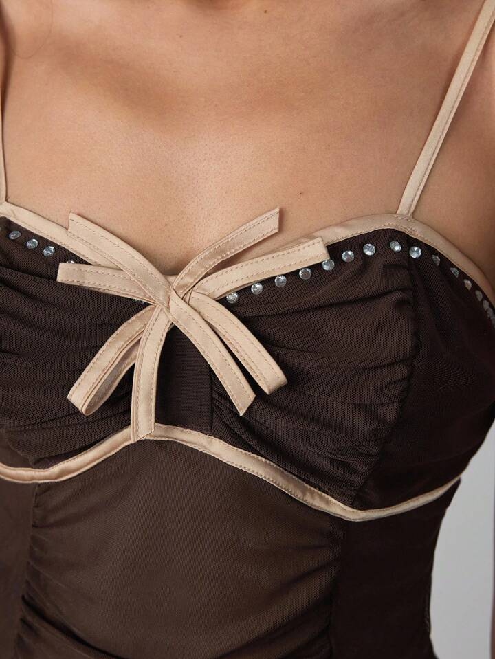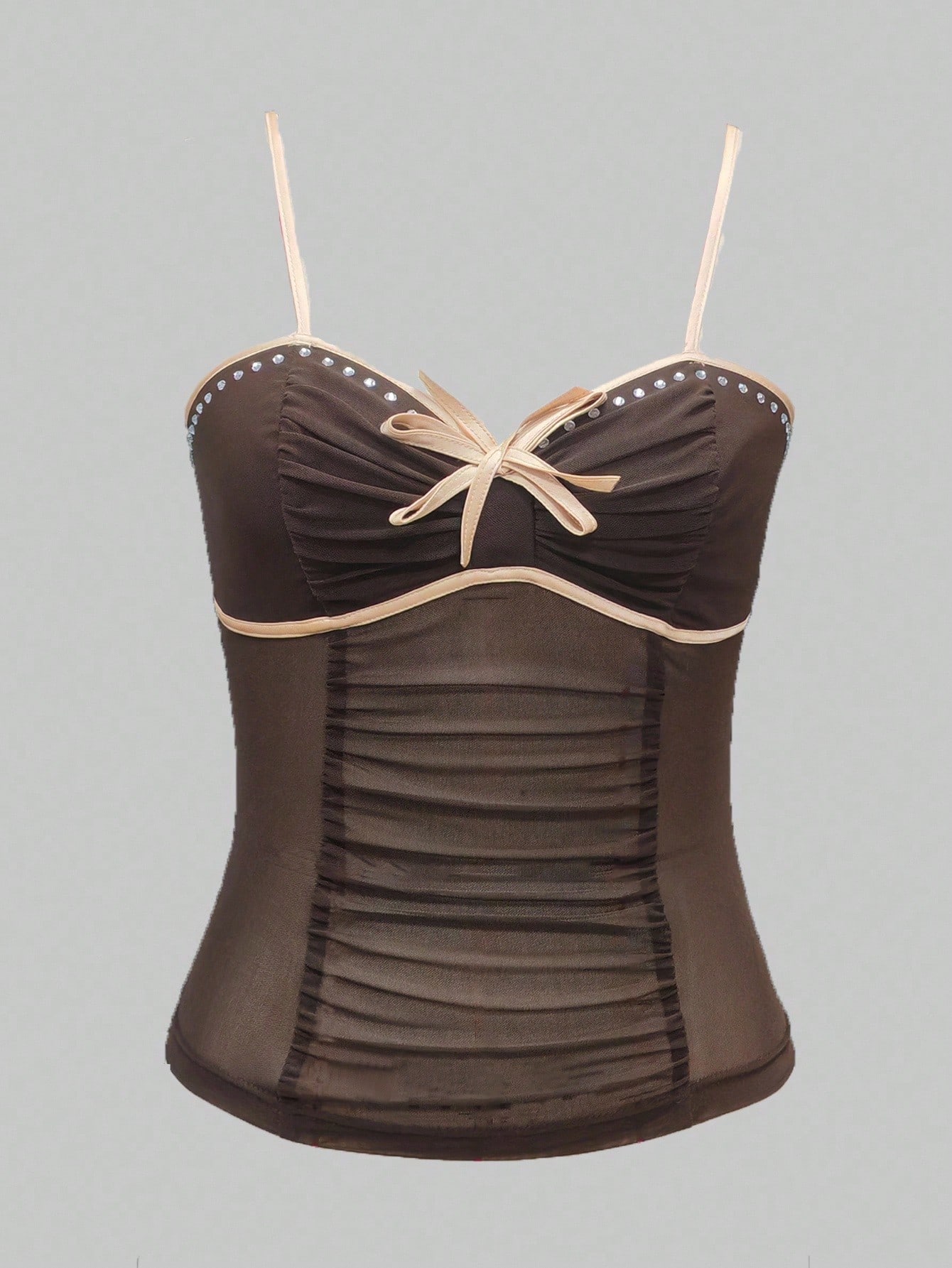 Hippie Top tipo camiseta de tirantes ajustable, plisado, de malla suave, color marrón translúcido y con detalles de pedrería