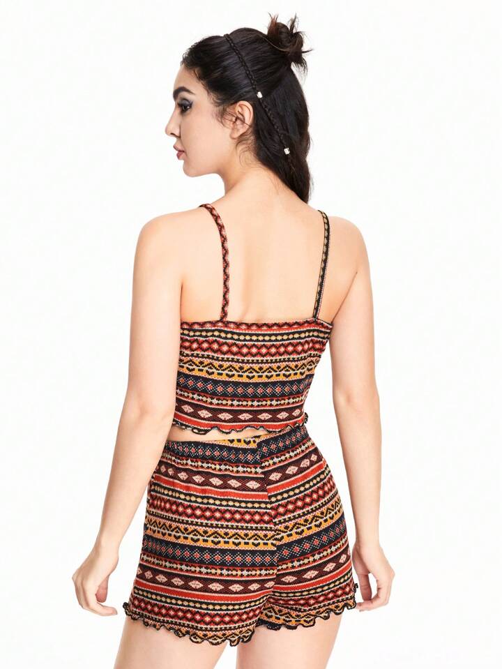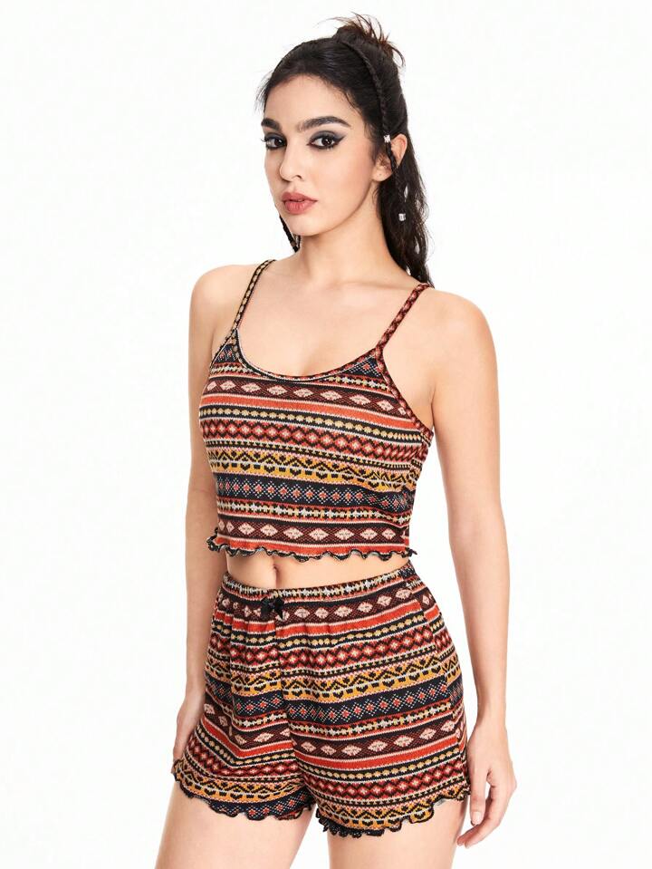 Conjunto de pijama con camiseta y pantalones cortos con estampado geométrico suave en estilo hippie para mujeres