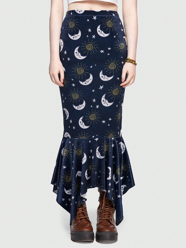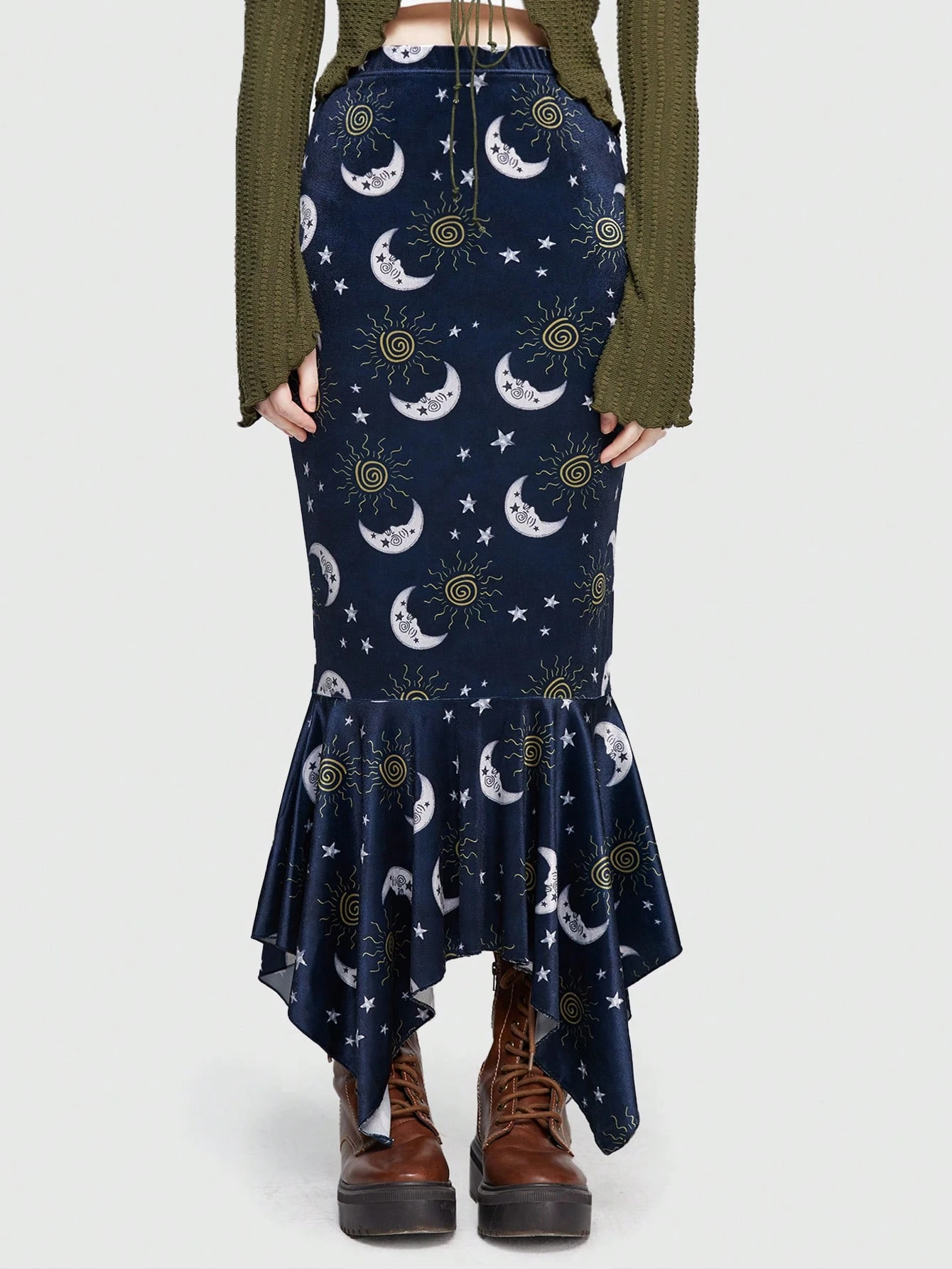 Hippie Falda bajo de sirena con estampado de sol y luna