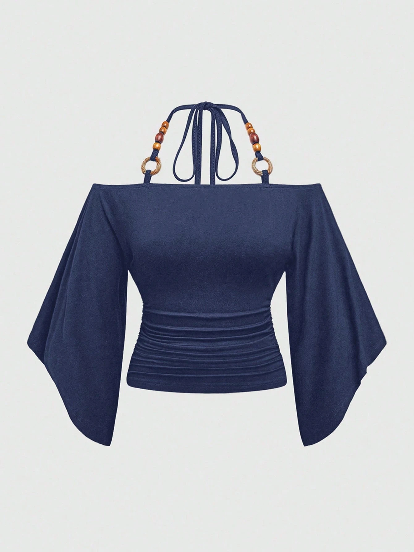 Hippie Camiseta holgada de manga murciélago con hombros descubiertos, decorada con cuentas de madera de talla grande para mujer, estilo vintage
