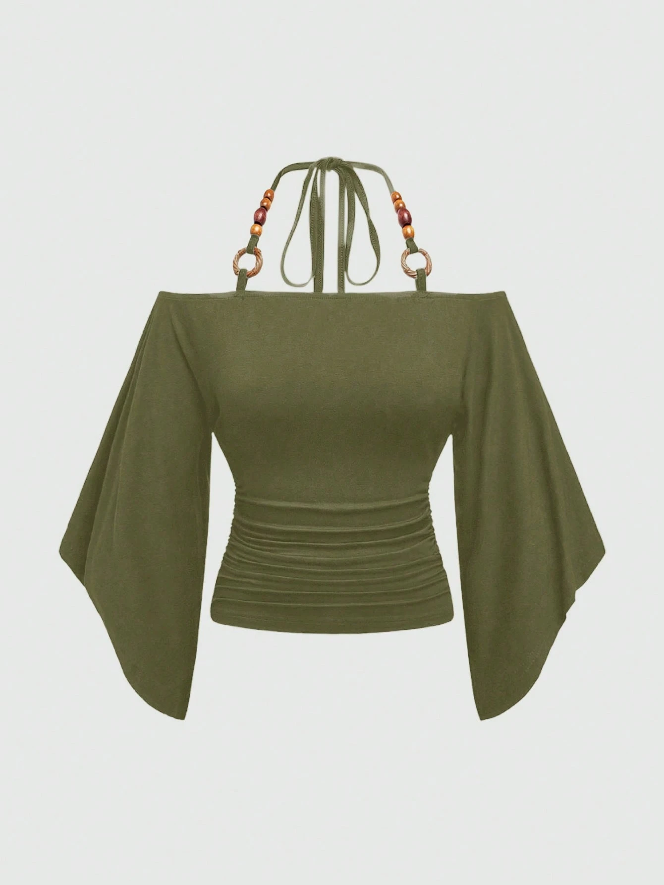 Hippie Camiseta holgada de una sola manga con decoración de cuentas de madera de estilo vintage para mujeres