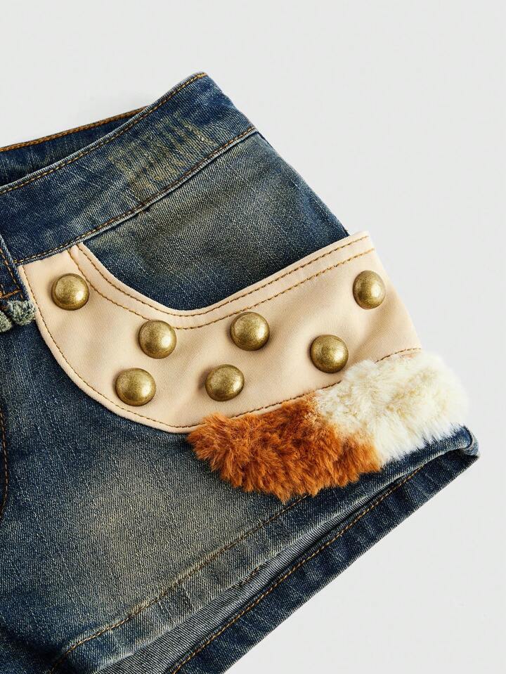 Hippie Pantalones cortos vaqueros de talle bajo, ajustados, mujer, con estampado de piel de animal patchwork, envejecidos, para festival de música vintage y vacaciones estilo bohemio