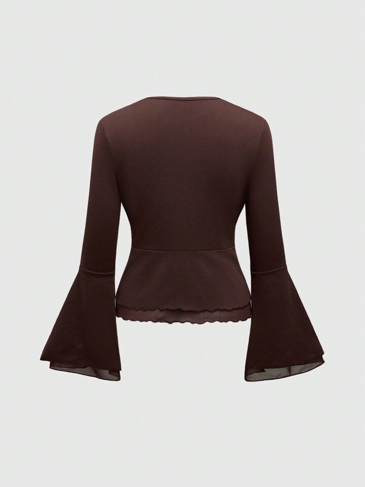 Camiseta ajustada de mujer con mangas acampanadas, cintura con doble volante y bordado de tótem hippie