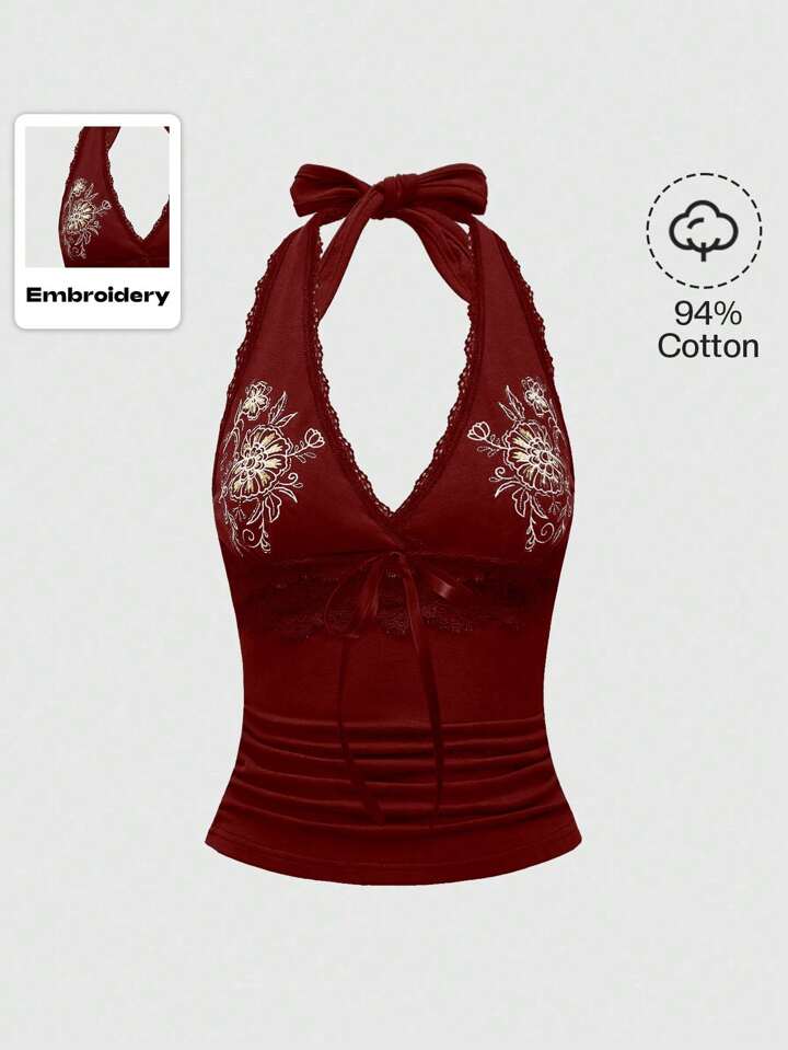 Hippie Blusa sin mangas con cuello de halter, encaje y volantes para mujer