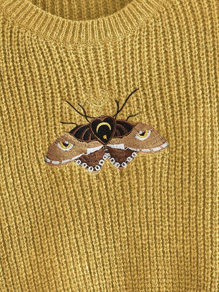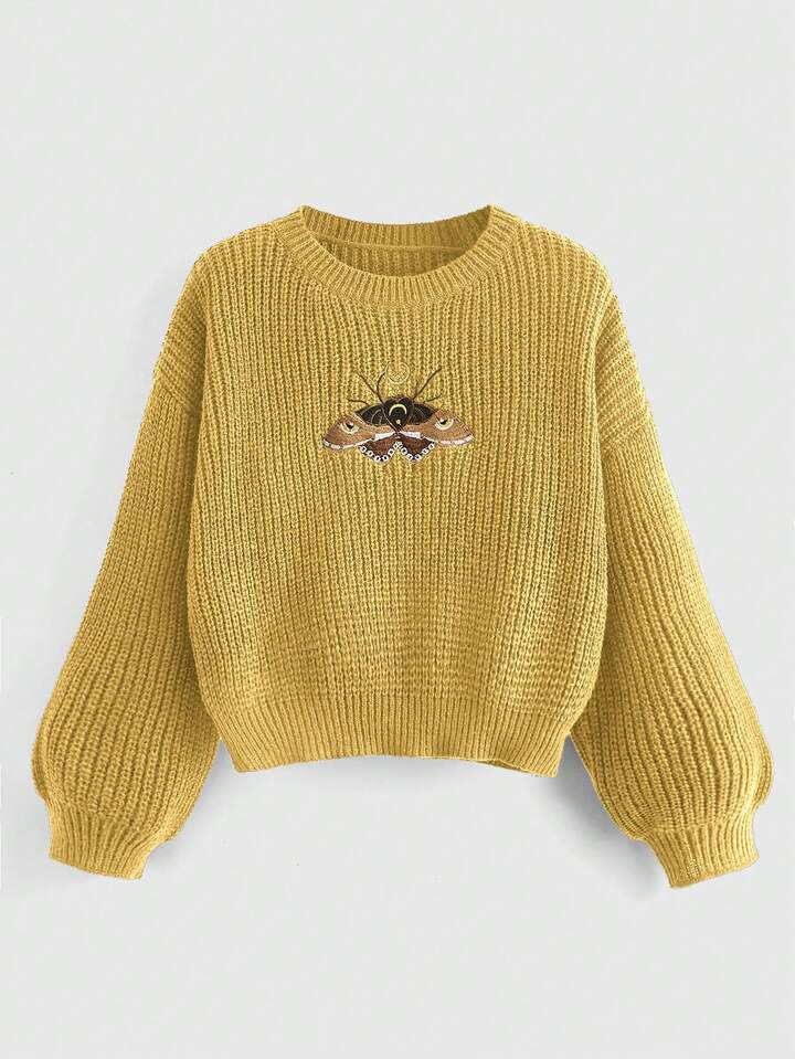 Hippie Suéter de cuello redondo casual y versátil de manga larga con bordado de animales para mujer