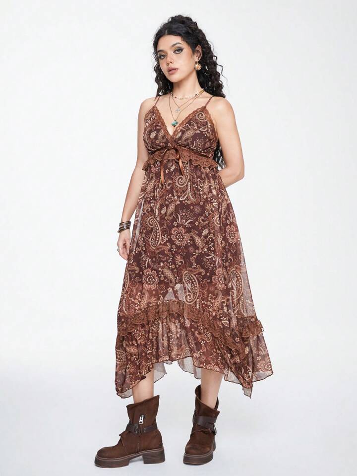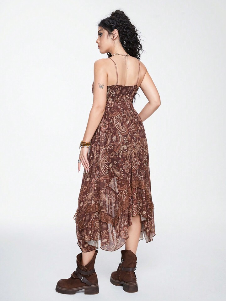 Hippie Vestido de encaje en línea A con bajo asimétrico y estampado de paisley para mujer