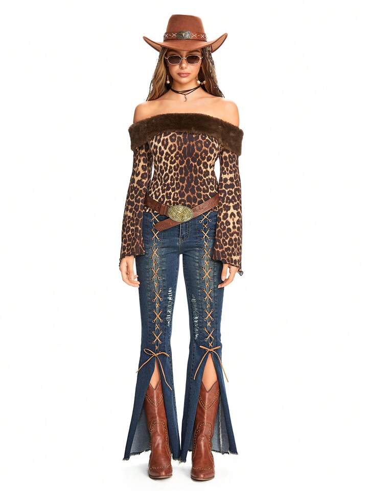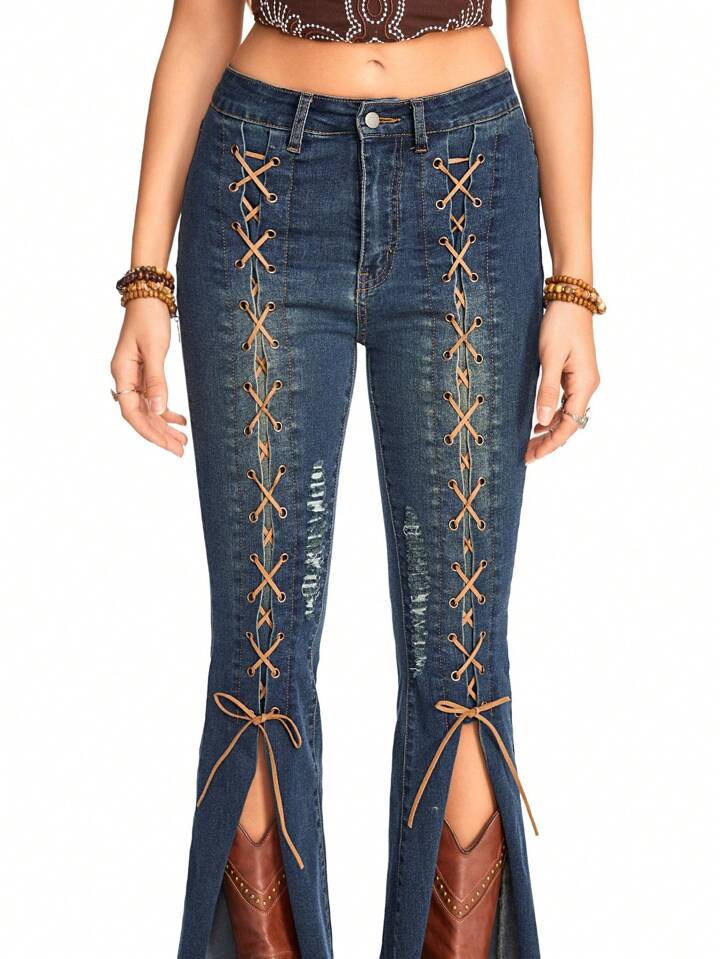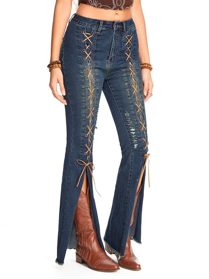 Hippie Pantalones acampanados con estampado de venados bohemios, de terciopelo, con cordón y orilla deshilachada para mujeres