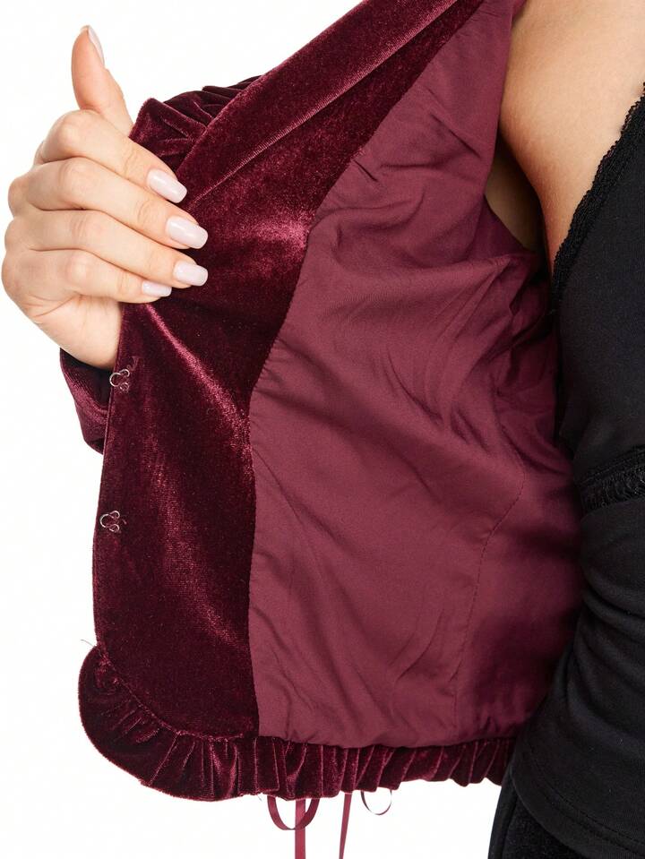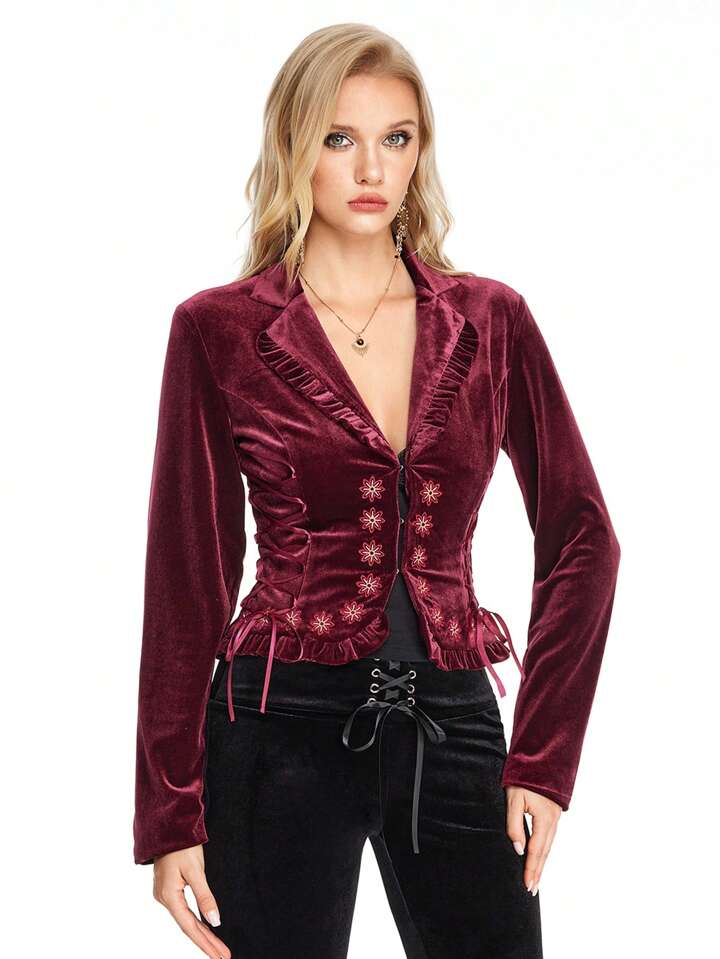 Hippie Blazer corto ajustado de terciopelo color vino con detalles de encaje bordado y cinta para mujer, estilo vintage aristocrático "Soñadora"
