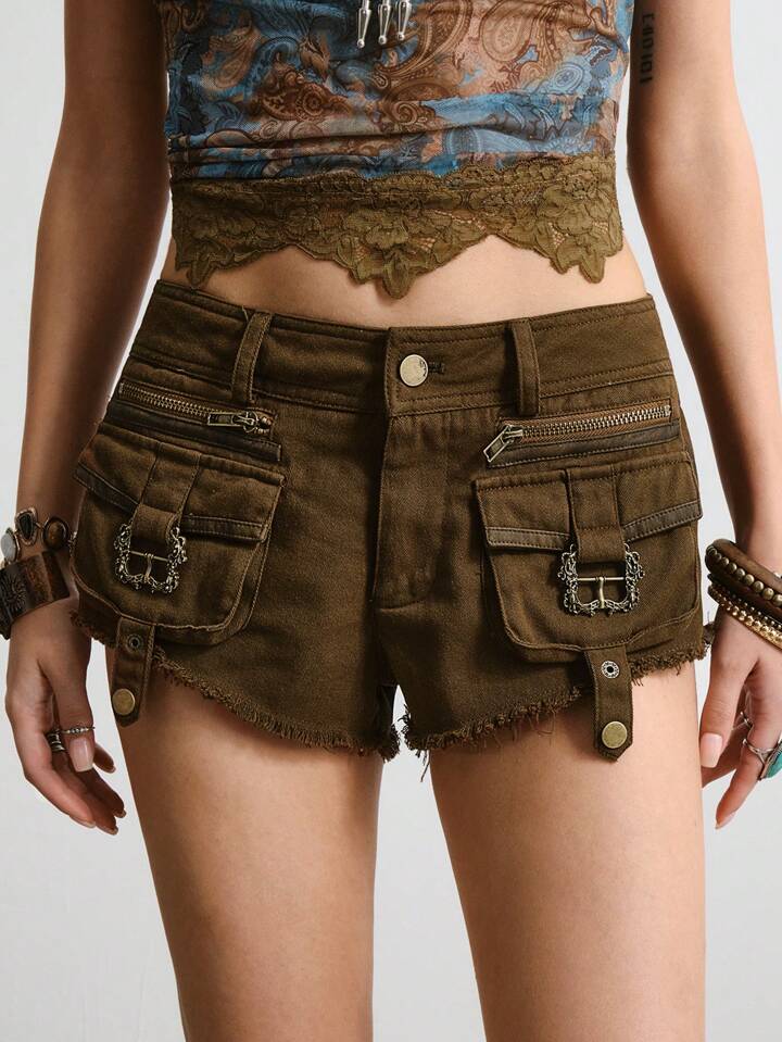 Hippie Pantalones cortos cortos con cintura baja, estilo retro bohemio, para vacaciones y festivales de música, con bordados